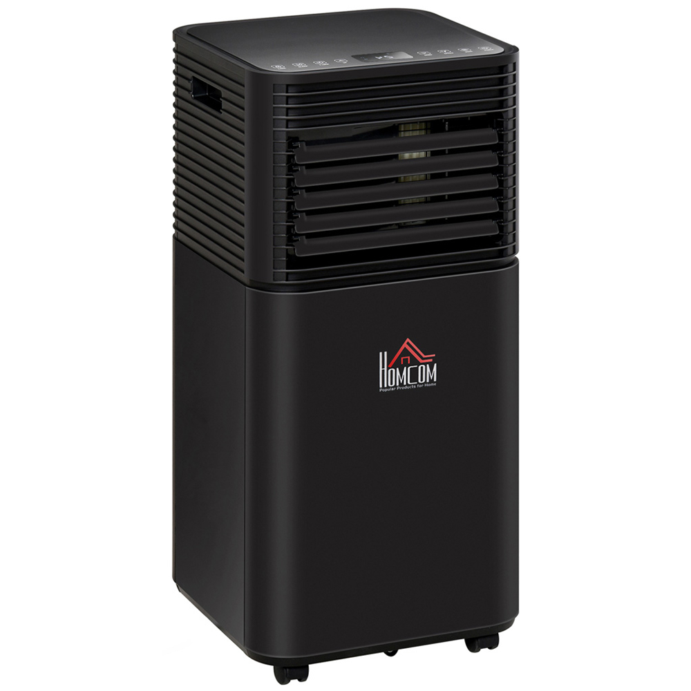 The summer heat can be unpredictable, which is why you need a multi-functional air conditioner unit to match. This HOMCOM Black 7000BTU 4 in 1 Air Conditioner does four jobs - cools, ventilates, dehumidifies and has a sleep mode. It switches between keeping the area at a specific temperature, blowing the fan around, drying the moisture out of the air, and gently increasing the temperature every hour. The sleep function gradually increases the temperature by 1°C every hour. The portable aircon unit is suitable for use all day long and in different climates. It automatically stops when the tank is full, safely preventing it from overfilling and causing damage. A 24-hour timer allows you to set a specific running time, especially when sleeping. EER A grade is perfect for saving electricity. This mobile air conditioner features an on-unit LED screen and comes with a remote. The sleep mode can only be set up with the remote. Control requires two AAA batteries (not included). The removable air filter keeps the air hygienically clean.