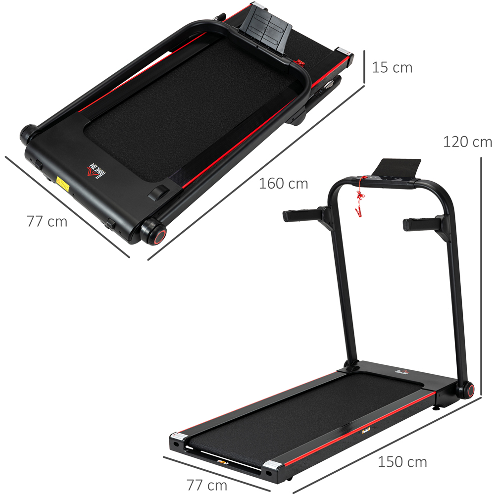 Get your fitness into gear with this motorised portable treadmill from HOMCOM. Reaching speeds up to 14 km/h, the running machines for home is perfect for beginners and the advanced runner to keep active indoors. The LED monitor helps keep track of the time elapsed, your speed, distance, and calories burnt, which in turn will keep you more focused whilst working out. Equipped with two wheels to move this compact treadmill around easily, it's finished with an emergency button for safety.