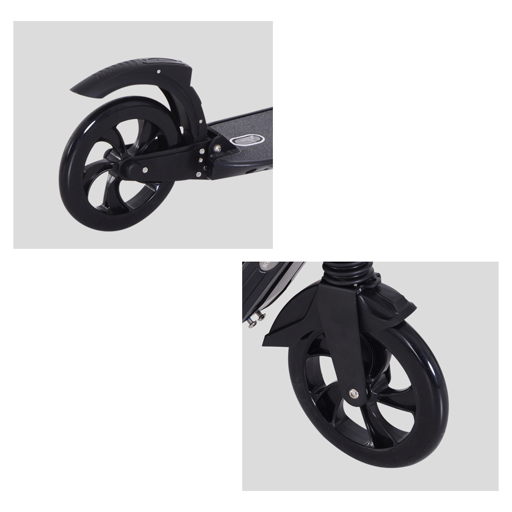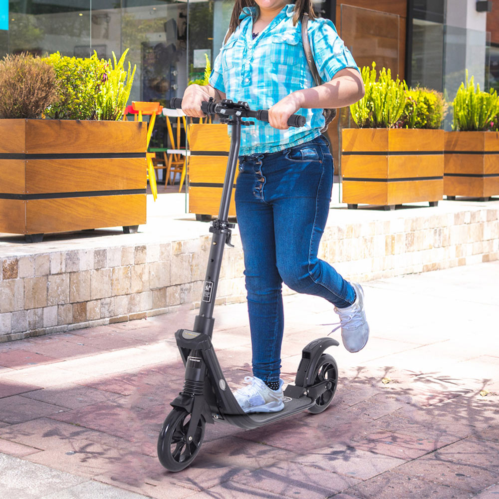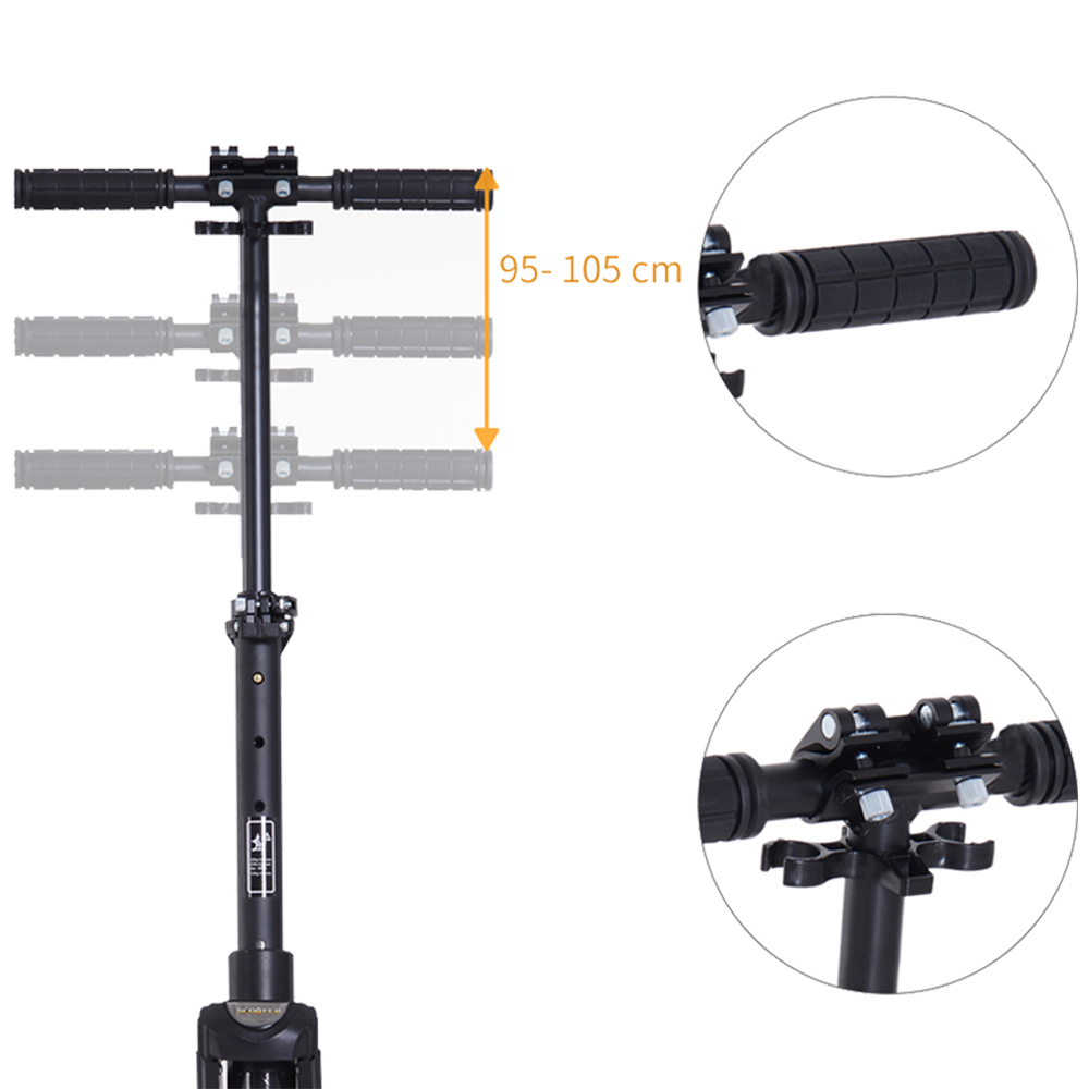 Ride around with this Black Kick Scooter from HOMCOM. The commuter scooter features an adult suspension frame that is sturdy and lightweight. It is crafted into an innovative folding design, allowing the scooter to be opened and closed quickly. Adjustable from 95 to 105cm, the scooter's handlebar can comfortably suit various heights. Complete with a rear-wheel fender braking system, it ensures a safe ride and maximum fun.