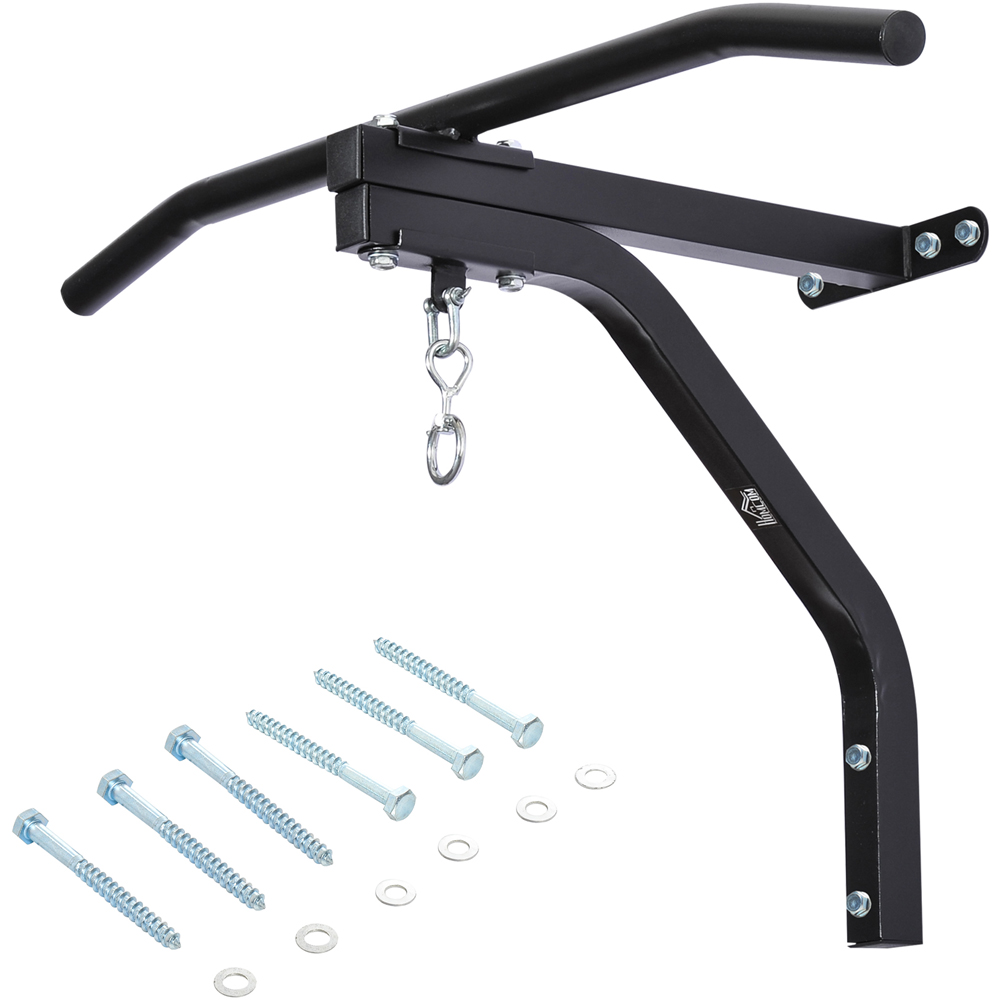 This punch bag bracket with a chin-up bar is an effective way to work most of the upper body muscles and it is an ideal trainer for shaping your upper body, chest, back, and arms. Perfect for the home gym or health club, this hanger can be used for boxing, kickboxing, or MMA bags. The wall mount comes with all of the necessary hardware. Constructed of heavy-duty steel, our wall hanger is durable and safe for a lifetime. 2 in 1 Pull-up and punch bag wall bracket for boxing, kickboxing, and MMA heavy bags up to 130kg. The punch bag hanger constructed of heavy-gauge solid steel for worry-free usage and superior durability and stability. This boxing bag bracket comes with heavy bag swivel chain hanger and all necessary hardware. HEAVY BAG NOT INCLUDED.