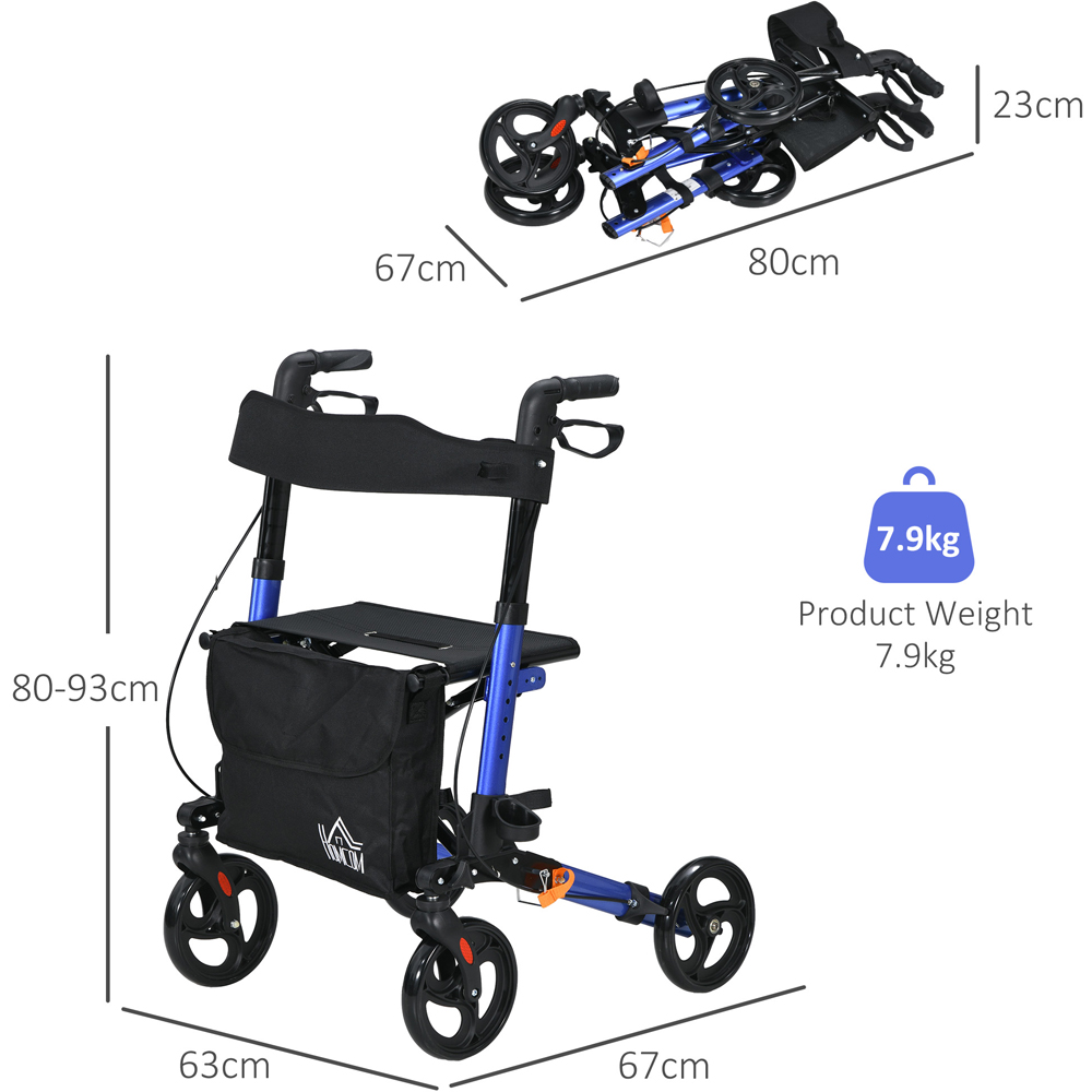 This HOMCOM lightweight rollator walker rolls with you, making journeys stress free. A powder coated aluminium frame for a strong, yet lightweight core, it is fitted with a seat so you can take a break whenever you want. It can be folded into a smaller size for convenient storage and transport. A storage bag to take small essentials with you on the journey. Four wheels for smooth movement, this mobility walker is complete with a dual brake for safety.