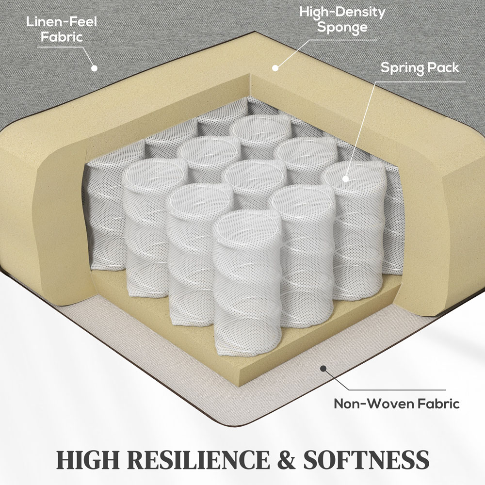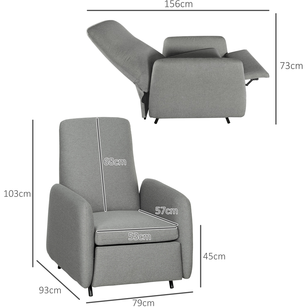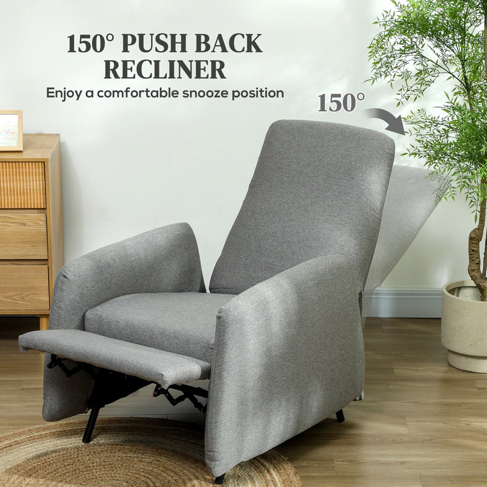 Experience the support and comfort of the HOMCOM reclining armchair, featuring a 150° push-back recline with built-in footrest for the relaxation. To return upright, push the footrest back into place with your heels and the back of the recliner will simultaneously return to its original position. Enjoy the supportive comfort with pocket spring seat filled with high-density sponge, wrapped in breathable linen-feel fabric. Make your lounging experience a bliss with this living room chair. Push back recliner: Experience the comfortable position with 150° reclining back and built-in footrest of this recliner chair for better snooze. Seamless transit from reclining to sitting with your heel push against the footrest back into place Spring pack seat cushion: Built with a pocket spring pack and filled with high-density sponge, it prevents cushion deformation from frequent or prolonged use and extends the lifespan of the armchair. 18cm thick back cushion adds padded comfort Quality materials: Upholstered in a linen-feel fabric that resists wear and pilling, paired with a robust steel frame, this bedroom chair combines longevity with stability.