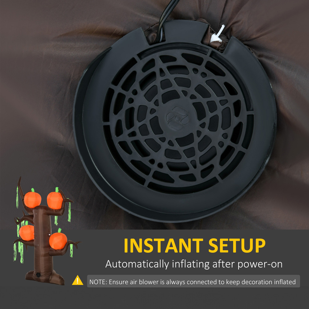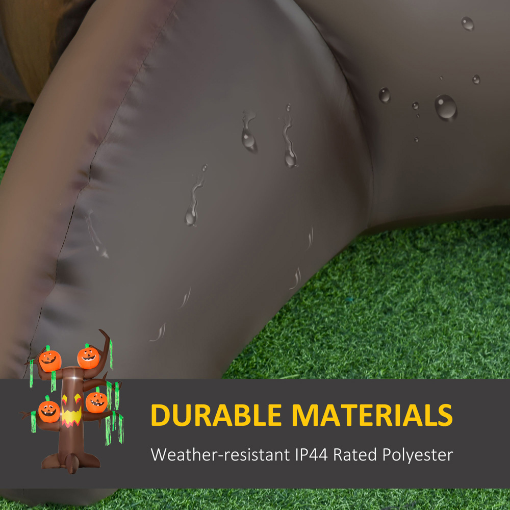 Get ready to create a spooky atmosphere at your Halloween party with the HOMCOM Halloween Inflatable Ghost Tree with Pumpkins 8ft. This inflatable tree featuring ghosts and pumpkins inflates automatically when powered on. It's a family-friendly Halloween decoration that you can use year after year. With built-in LED lights, it's perfect for nighttime display and is waterproof, making it suitable for both indoor and outdoor use. You can set it up in moments with the included inflator fan. The fabric is tear-resistant and retains its shape and colour. The IP44-rated shell makes it safe for mild weather conditions outdoors. This Halloween garden decoration comes with four ground stakes, two drawstrings, and a sandbag to keep it weighted and in place during windy weather at your front entryway.