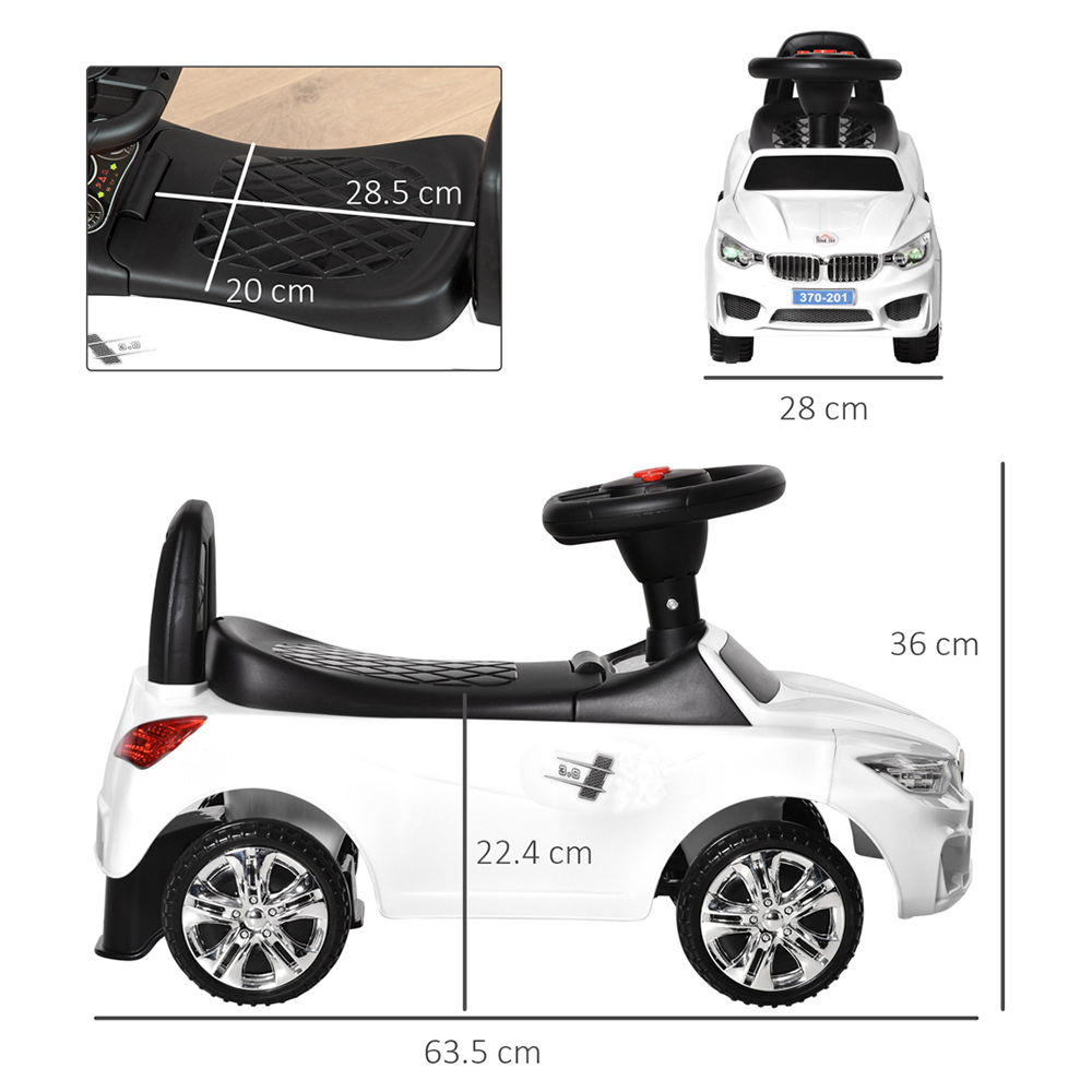 Ride in style with this fancy White Sliding Car from HOMCOM. This car features a red body and snazzy rims that look similar to a real car. Perfect for 18 to 36-month-old children, this car comes with PP seats and high backrests that offer young riders ultimate comfort. With added music and flashing headlights, the entertainment on this ride is endless. It also comes with a secret base under the seat to keep toys and snacks. Complete with a big steering wheel and an anti-overturning system for fun and safety.