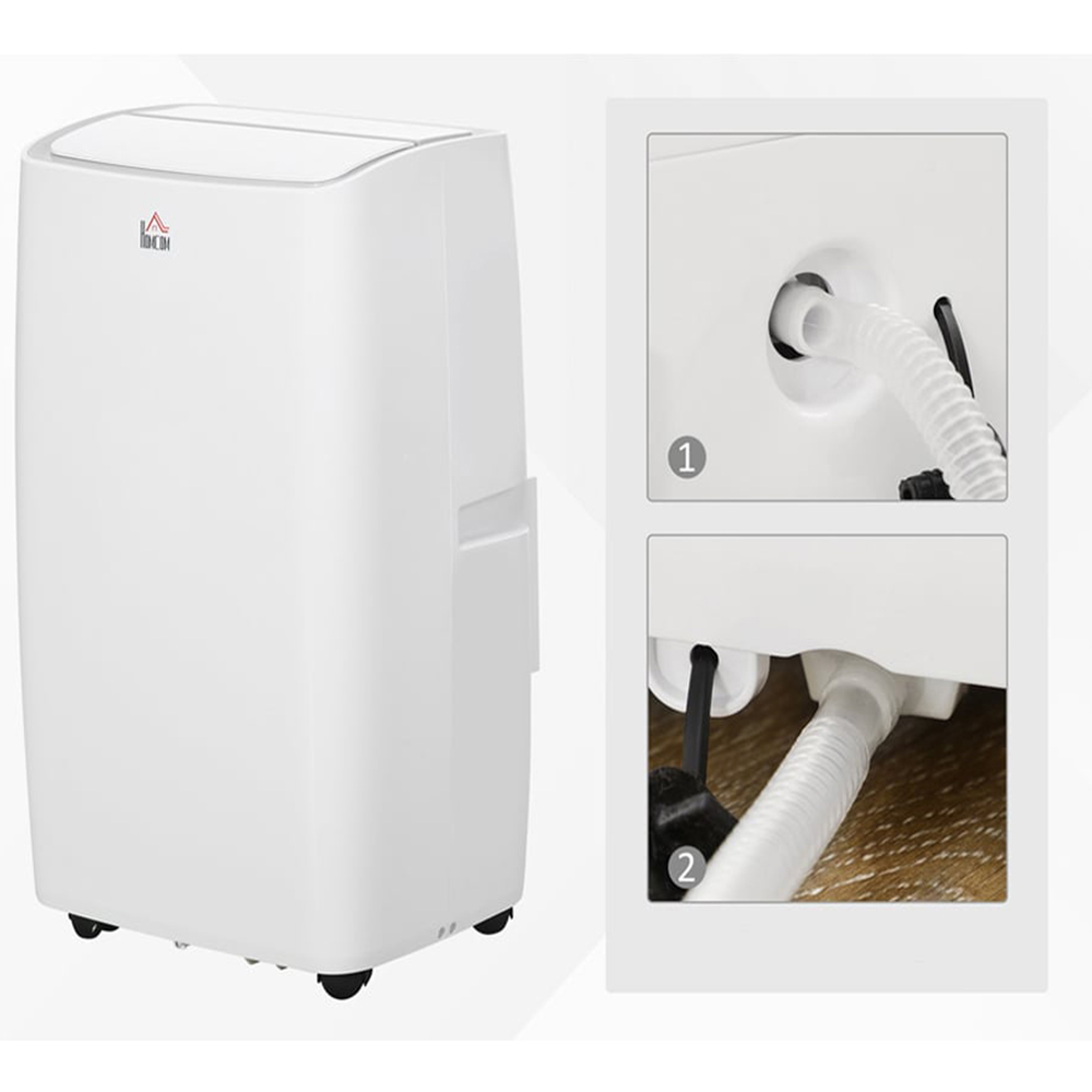 Keep yourself cool and comfortable during the summer with this HOMCOM White 12000BTU Air Conditioner. Its self-evaporating system evaporates the water it removes, so you don't have to get rid of it yourself. Also, with cooling, dehumidifying, and ventilating functions, remote control, and several other features, this air conditioner makes the perfect smart partner for your home. Apart from this, it comes with a sleep mode with a 24-hour timer and child lock for added peace of mind. Portable and compact, the device includes four swivel wheels for easy movement, so you can just move it with you from the bedroom to the living room without hassle. The unit comes complete with a removable and washable filter to ensure clean air circulation. Size: 71 x 41 x 33.5cm.
