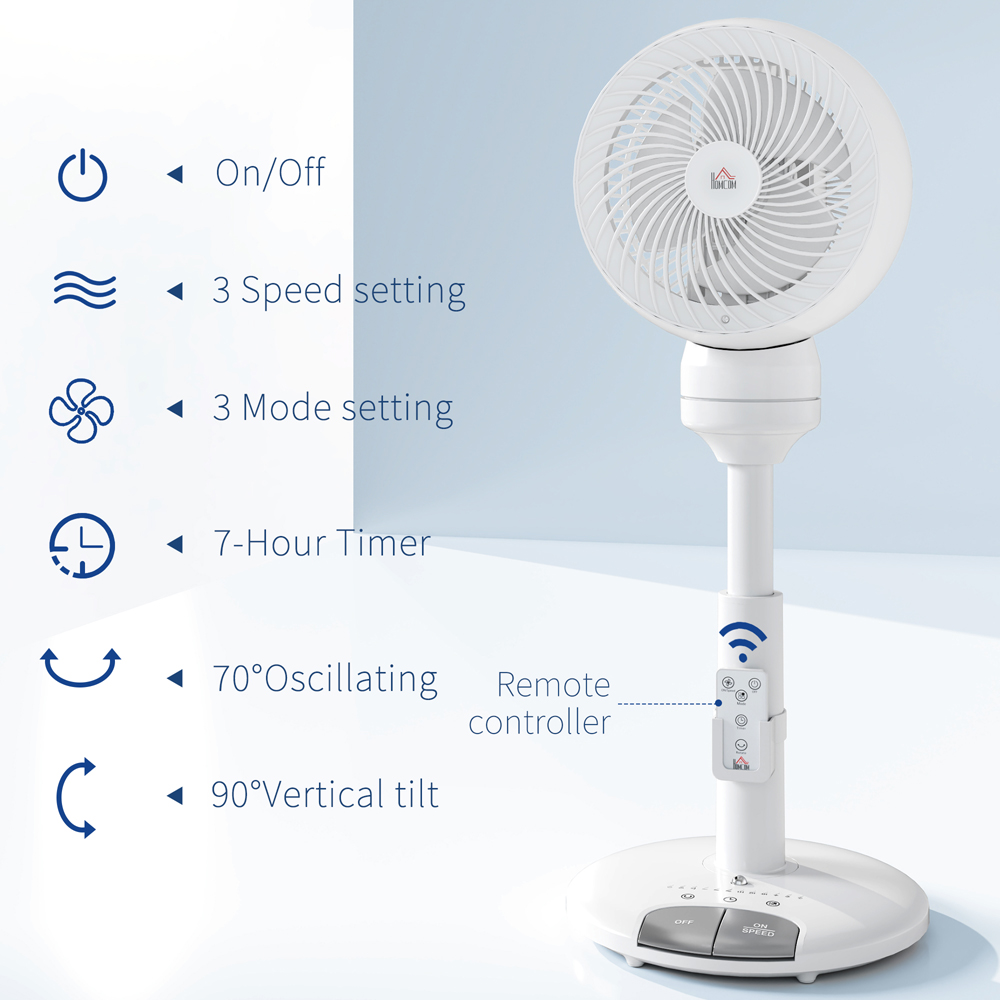 Experience a refreshing breeze on those sweltering days and nights with the HOMCOM 9 Inch Height Adjustable Air Circulator Fan, designed to keep you cool with its versatile settings. This sleek white fan is a perfect addition to any home or office, offering three-speed settings and modes to tailor your cooling experience. Its adjustable features include 70° oscillation, 90° vertical tilt, and 360° rotation, ensuring targeted airflow exactly where you need it. The built-in seven-hour timer makes it ideal for uninterrupted overnight use, and the convenient carry handle and included remote control enhance its usability and functionality.