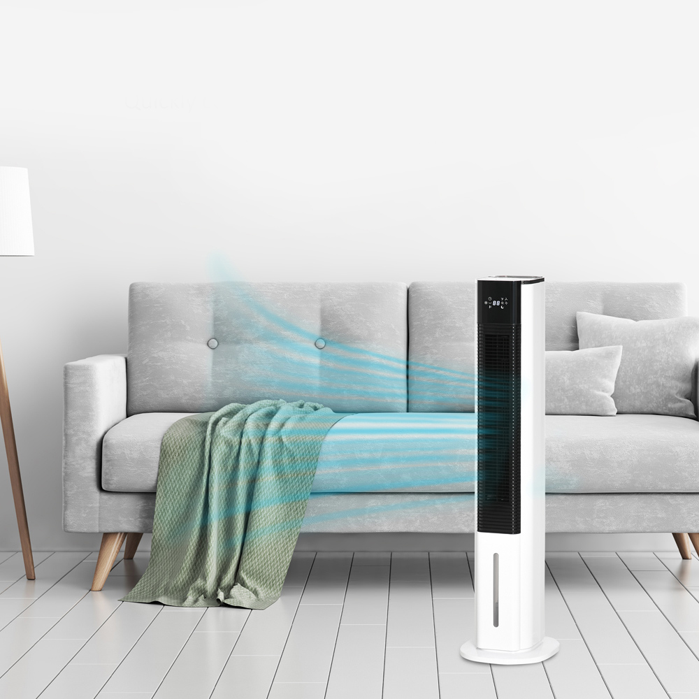 Make your indoor summer ready with this HOMCOM White and Black Evaporative Air Cooler with Remote 6L. Besides being a cooler, this unit also works as a humidifier, releasing moisture into the air when your home feels damp. Packed with functions, the unit offers normal, natural, and sleep modes along with low, medium, and high speed to easily pick a combination to suit your needs. With two boxes to fill with ice, this evaporative air cooler is great for hot days and nights. Apart from this, the 12-hour timer function is ideal for scheduling your cooling cycles for hassle-free use and low energy bills. Easy to use, the unit comes complete with an LED panel and remote controller. Size: 42 inches.