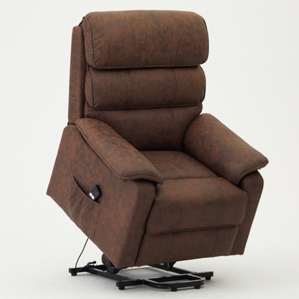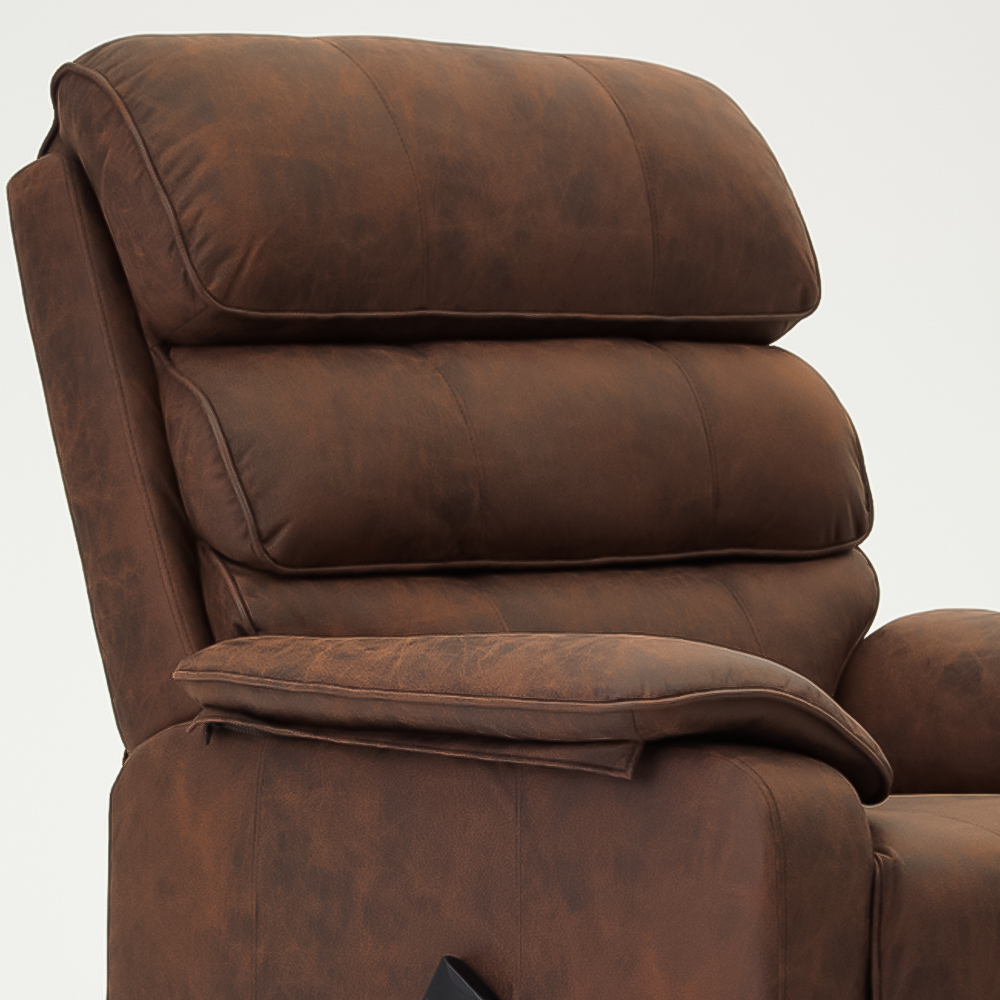 Sink into comfort and luxury every day with the Home Detail Blair Brown Electric Recliner Chair. Improve your relaxation and comfort with an electric tilt and lift riser recliner armchair. With an easy-to-use remote control, you can effortlessly adjust the chair's position to your liking. When it's time to stand up, the riser mechanism gently lifts and tilts forward to help you get back on your feet. The recliner chair is designed with both comfort and mobility in mind, making it perfect for those with limited mobility or anyone who simply needs a little extra assistance in achieving maximum relaxation. You'll appreciate the supportive and cosy design that ensures comfort from head to toe. Air leather is a woven fabric made to look and feel like leather but has the breathability of fabric for a more comfortable feel. Additionally, the chair is certified in the UK with UKFR and FSC, assuring quality and safety.