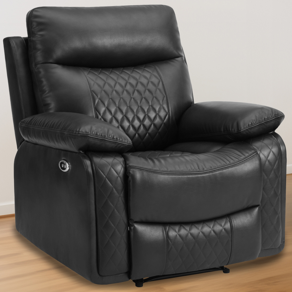 Enhance your home interior with the Home Detail Carson Single Seater Black Faux Leather Fabric Electric Recliner Sofa. It is easy to adjust the seat’s positions at the touch of a button. This recliner has a generously padded backrest and curvaceous armrests. It has a beautiful diamond stitching detail on the lumbar, footrest and front of the armrest. It comes with a colour pallet of Black faux leather. The faux leather is a durable fabric with strength and longevity, which means your sofa bed will last you a very long time. It is super easy to clean. It is handmade and handcrafted to the highest construction standards and is built to last. Care and Use: One of the best ways to keep this sofa looking great is to vacuum it once a week. Use a low setting and the upholstery attachment of your vacuum cleaner to avoid any damage to the fabric. Just make sure to vacuum in the direction of the pile. Alternatively, using a soft hand brush can fluff the fibres back up and keep the fabric colour intact. Fabric appearance may vary due to differences in lighting and screen resolution on various devices. Please note: This sofa is a large item, so please ensure it will fit through any access doors and walkways up to and within your property. It requires a minimum door width of 80cm.