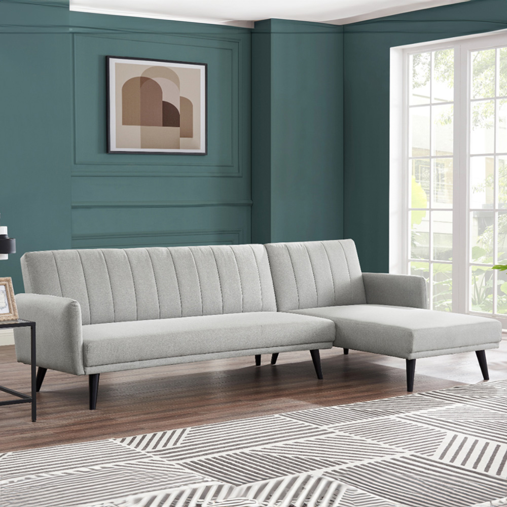 Unfold the comfort and maximise your space with the Home Detail Clinton Double Sleeper Light Grey Sofa Bed with Chaise, an ideal solution for those in search of a space-saving sofa bed. This stunning L-shaped sofa bed in a delightful light grey woven fabric is a bold and stylish piece that will command attention in any living space. Boasting a sumptuously padded seat and backrest, sleek armrests, and a contemporary silhouette, this sofa bed effortlessly combines comfort with modern design. What sets this sofa bed apart is its versatile chaise, which can be easily attached to either side of the sofa bed to suit your preference. Alternatively, you have the option to keep the chaise separate to create a chic two-piece set. Perfect for maximising space in compact living areas or guest rooms, this sofa bed is the ultimate space-saving solution. Thanks to the user-friendly clic-clac system, you can effortlessly transition from an upright position to a recline or bed position and back again with minimal effort. Experience the convenience and style of this exceptional sofa bed today. Care and Use: One of the best ways to keep this sofa looking great is to vacuum it once a week. Use a low setting and the upholstery attachment of your vacuum cleaner to avoid any damage to the fabric. Just make sure to vacuum in the direction of the pile. Alternatively, using a soft hand brush can fluff the fibres back up and keep the fabric colour intact. Fabric appearance may vary due to differences in lighting and screen resolution on various devices. Please Note: This sofa is a large item, so please ensure it will fit through any access doors and walkways up to and within your property. It requires a minimum door width of 80cm.