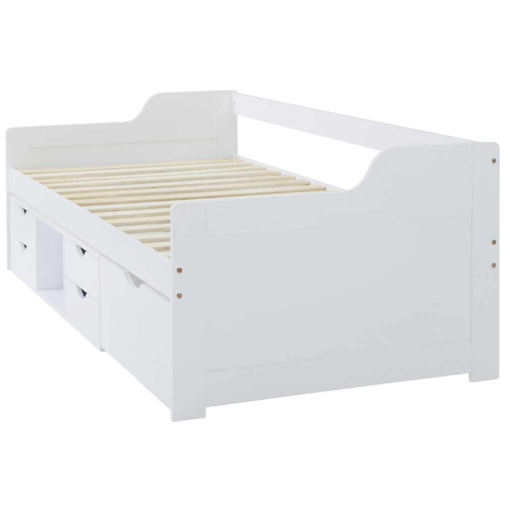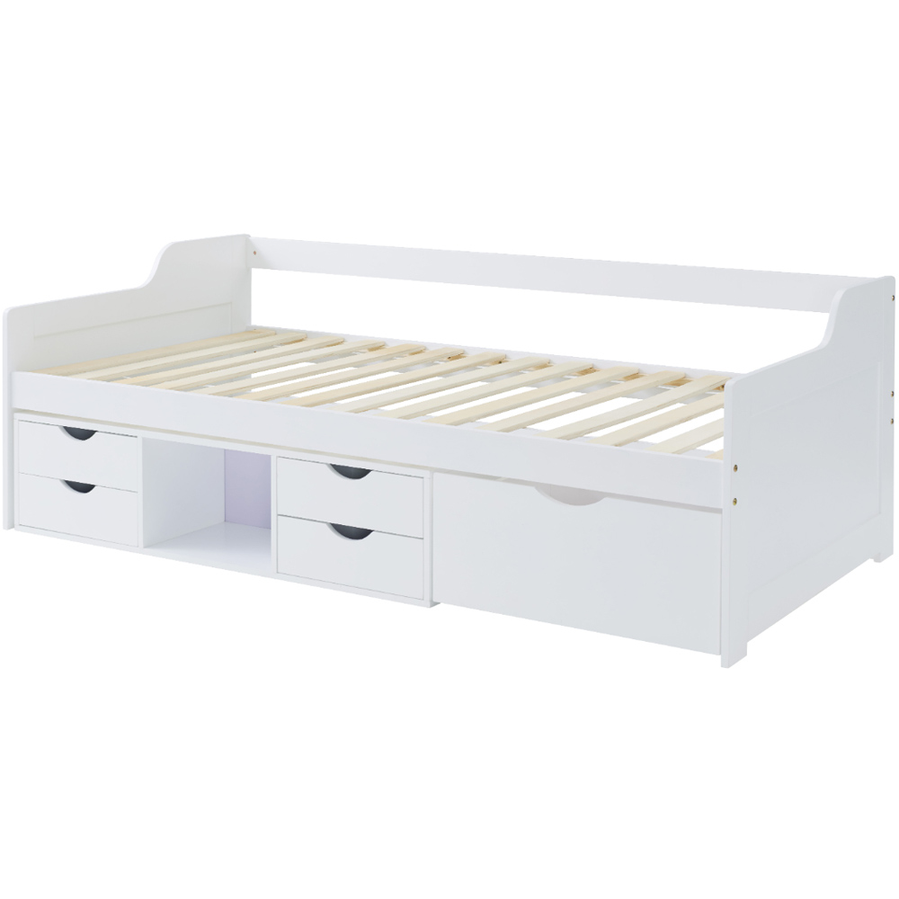 Elevate your bedroom's decor with this Home Detail Durham Single White Kid's Day Bed with Storage. It's crafted from wood and flaunts a white hue to add a touch of charm to your space. This bed is ideal for any children's bedroom that requires more storage space. It features additional storage drawers and spaces to store away toys, books and more. Plus, this bed is all UK-certified with FSC.
