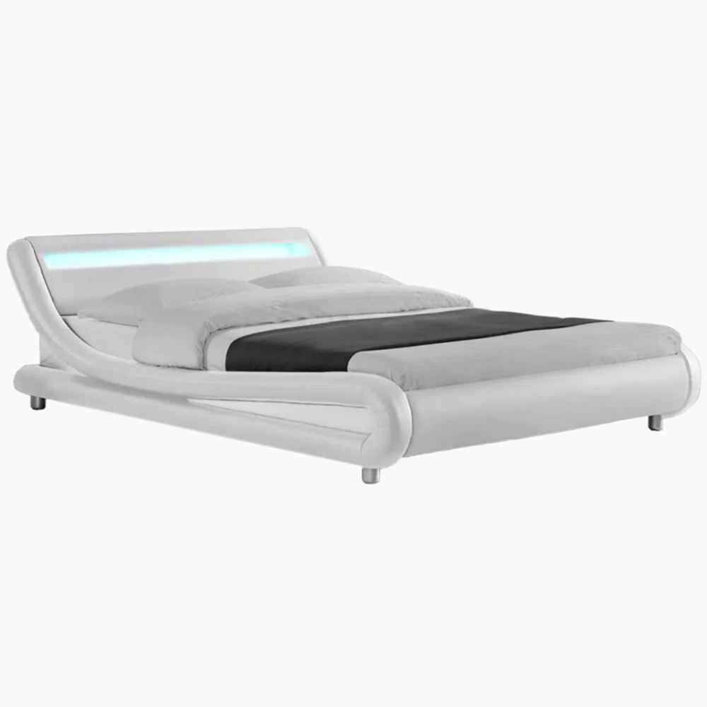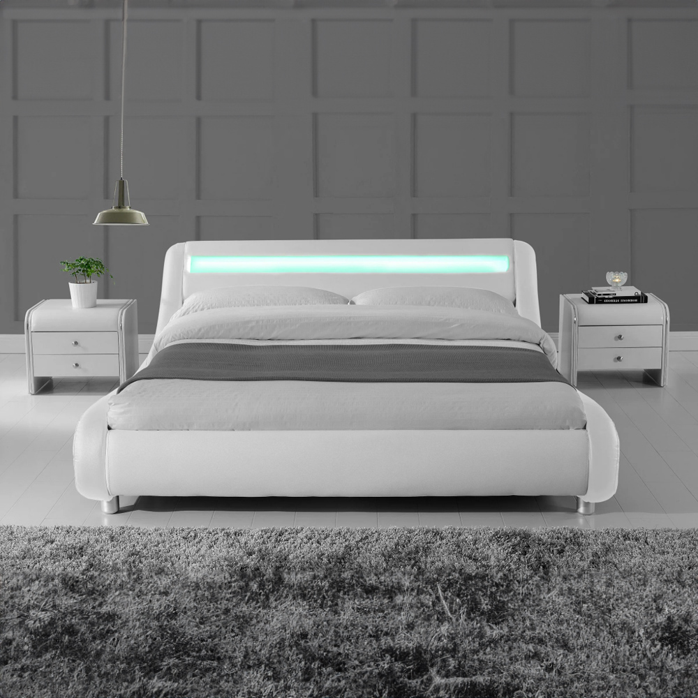 Transform your bedroom with the Home Detail Galaxy Double White Faux Leather Bed Frame with LED. Featuring a low bed base and curved headboard, it combines contemporary design with comfort. Crafted from durable faux leather, it ensures lasting quality and easy maintenance. It also features a standout LED headboard that's operated by a remote control. Customise your ambience with a choice of blue, orange, pink, green or purple lighting. For added flair, the LED headboard offers a strobe setting, a flash setting, and a smooth change mode for gentle transitions between colours. Each bed is UK-certified with UKFR and FSC, ensuring the highest standards of safety and sustainability. Please note: Due to the unique curved nature of the headboard, it accommodates a maximum mattress thickness of 20cm.