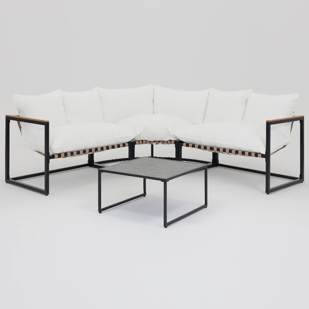Elevate your outdoor experience with a Home Detail Marbella 5 Seater Black Corner Sofa Set with Ivory Cushions. This set has a ivory 25cm seat and back cushions and a garden cover. The set comes with garden corner sofa set with table. It is made with a black steel metal frame and contrasting brown polyester seat back strap. It has a polyester back design, and it is recommended that you bring your seat indoors during damp and cold conditions. It is also recommended that you bring your cushions indoors and use the garden cover when not in use for longevity.
