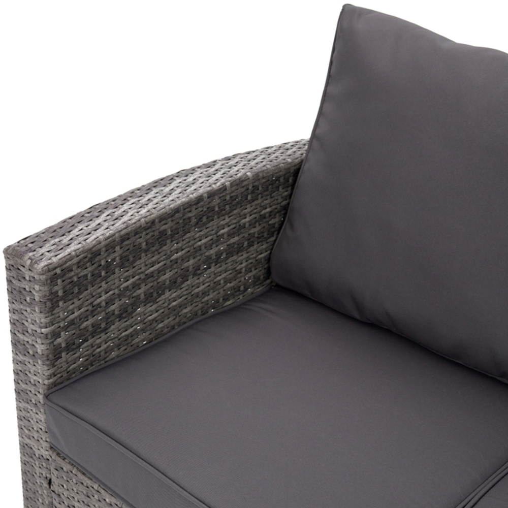Enhance your outdoor area with the Home Detail Paloma 5 Seater Grey Rattan Sofa Set. Crafted from durable PE rattan with a sturdy steel metal frame, it is built to withstand the elements while offering a sophisticated look. It includes a 3-seater sofa, a 2-seater sofa, a side table with hidden storage, and a coffee table with hidden storage. The storage can be accessed by lifting both the table tops. Care and Use: We recommend that you bring your cushions indoors and use a garden cover when not in use for longevity.