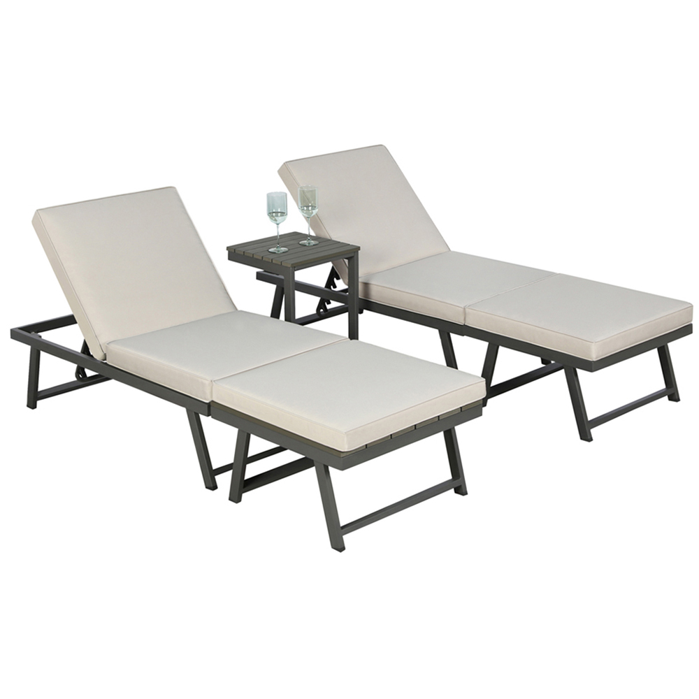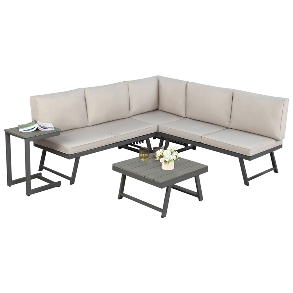 The Monaco Lounge Corner Sofa Set is a stylish and practical addition to any outdoor space, combining modern design with everyday comfort. This versatile garden corner sofa easily transforms into two sunbeds, making it the perfect solution for both lounging and soaking up the sun. With seating for up to four people, this lounge corner sofa set is ideal for everything from entertaining guests to enjoying a quiet morning coffee in the fresh air. Designed for versatility, the Monaco garden lounge set includes a corner sofa, and two matching tables: a coffee table and a side table, both featuring a durable plywood top for a sleek and natural finish. The weather-resistant spun polyester cushions and pillows provide lasting comfort, while the sturdy steel frame ensures durability season after season.