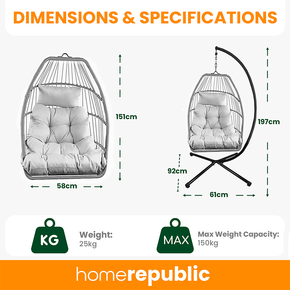 Enjoy the pinnacle of relaxation and style with this Home republic Miami Charcoal Egg Chair with Cushion. Ideal for any garden sanctuary, this chair combines comfort with practicality. It features a foldable design for easy relocation and includes a luxurious cushion and a sturdy hanging stand. It guarantees a pleasant lounging experience whether under the summer sun or indoors. The gentle sway motion provides unparalleled comfort and sophistication, making it perfect for reading a book or savouring the tranquillity of surroundings. The chair has rubber feet to prevent it from slipping. Plus, the chair is weather-resistant.