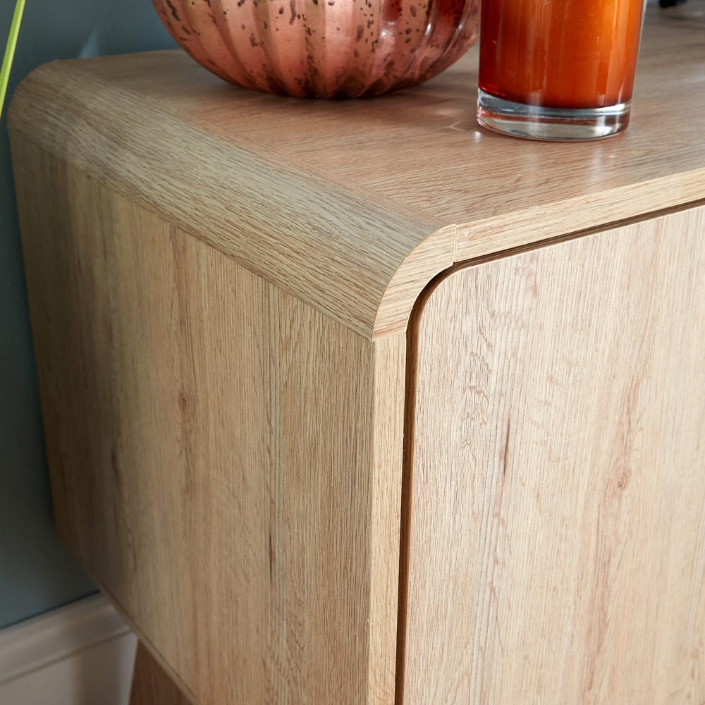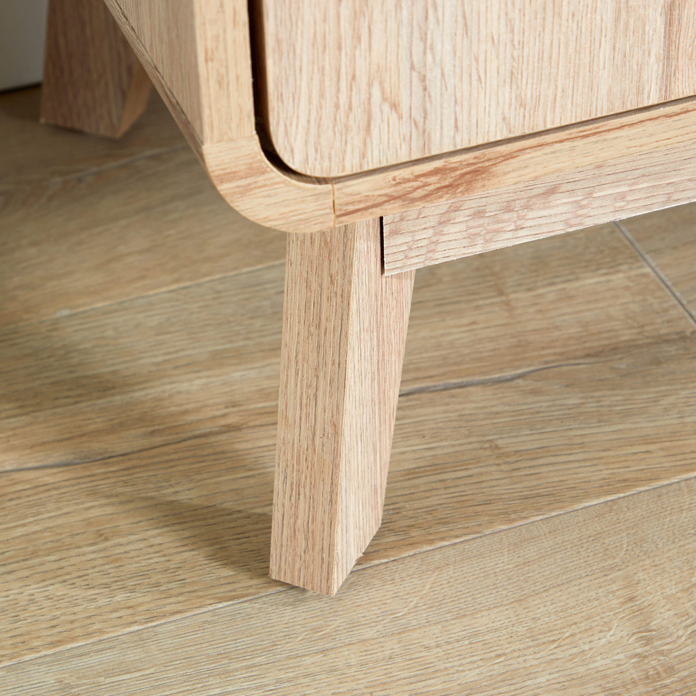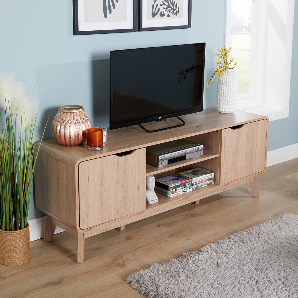 Quirky and stylish, this Nordic TV Stand is a great addition to your living room. It as two doors on either side and a central shelf to keep any books or consoles neatly stored and easy to access when you need to. Each drawer front offers a cut out handle and the frame has curved edges for added style. The rustic design is expertly crafted from high quality, sturdy wooden look MDF for longevity. Size: W150cm.