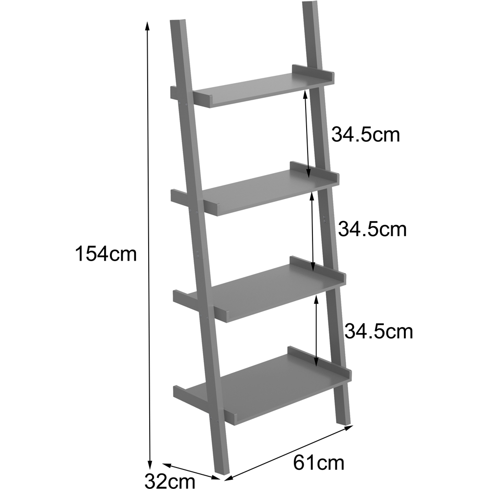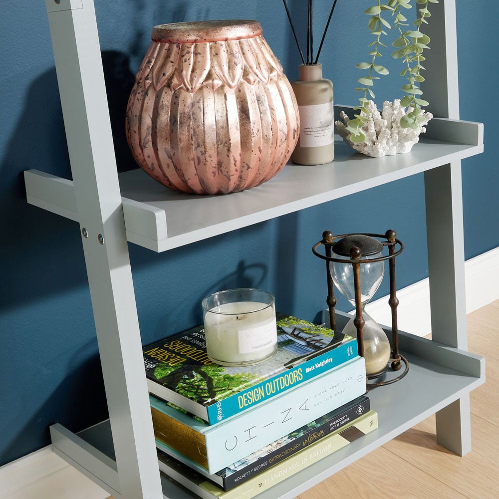 Designed in a chic grey, this small ladder shelf has three-tiered shelves on the ladder, each perfect for displaying various items. With lacquered MDF solid construction, the ladder shelf is easily assembled at your home. The small ladder shelf is stylish and will match many different interiors in your home. The practical design is useful for storage. Size = (W) 61cm (D) 20cm (H) 145cm.