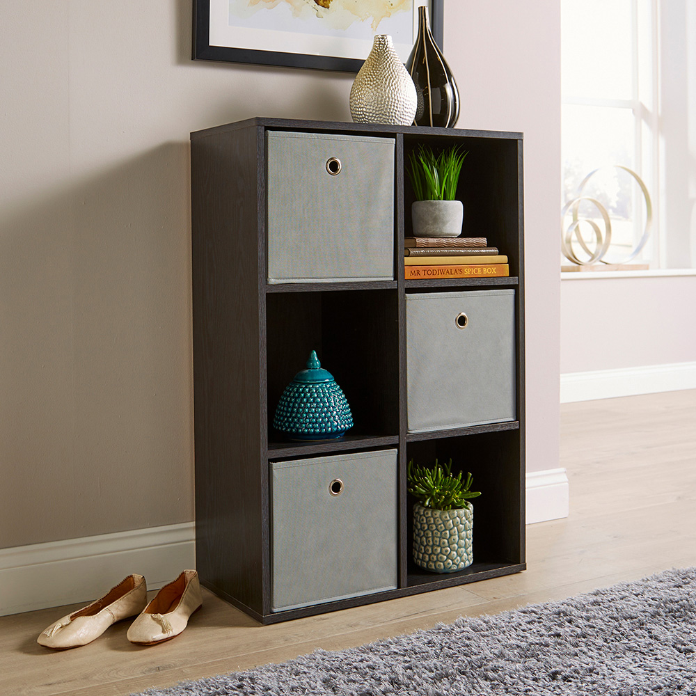 This 6 Cube Storage Unit is beautifully crafted in strong, durable 15mm thick board, all laminated in a variety of finishes. At almost 3ft by 2ft, it has 6 square storage spaces. You can have it portrait way up to maximise your storage and minimise the floor space that it takes up. You can also enjoy storing two ways too: place things straight onto the shelves, such as your books, or files and documents if it's in a lounge or home office. Or you could display ornaments and figurines in a lounge or dining room. Add the pull-out canvas storage cubes: they're great for storing anything from hair care to make-up, teddies to toys or almost anything. Size: W60cm D30cm H90cm.