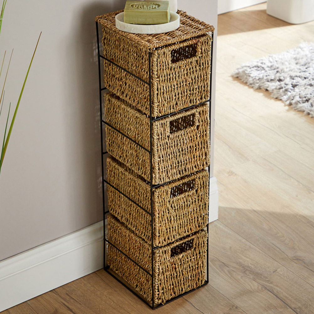 Transform your home’s organization with the Ankara Natural Wicker 4-Drawer Storage Tower. This stylish unit features elegant seagrass baskets paired with a sturdy metal frame, blending black and natural tones to complement any décor. Its space-efficient design is ideal for bedrooms, bathrooms or kitchens, making it a universal choice for those looking to save space. Enjoy the convenience of a fully assembled product—no assembly required!