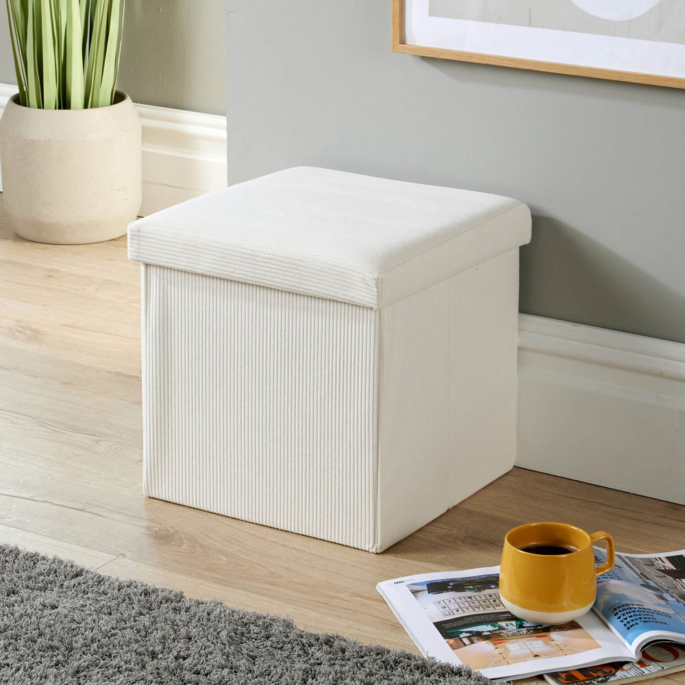 This Square Ottoman has a beautiful corduroy material where the light catches it in subtle contrasts of light and shade. For clothes and shoes, newspapers and magazines, paperwork and files, bedding and blankets, towels and toiletries: this one storage box stores them all, so have plenty around your home. They give you back more of your floor space too: after you've finished filling them, you can fold them flat. In fact, they are supplied them to you this way at the Big Furniture Warehouse: it saves space in the warehouses and wagons when they are stored and sent. Size = (W) 38cm (D) 38cm (H) 38cm.