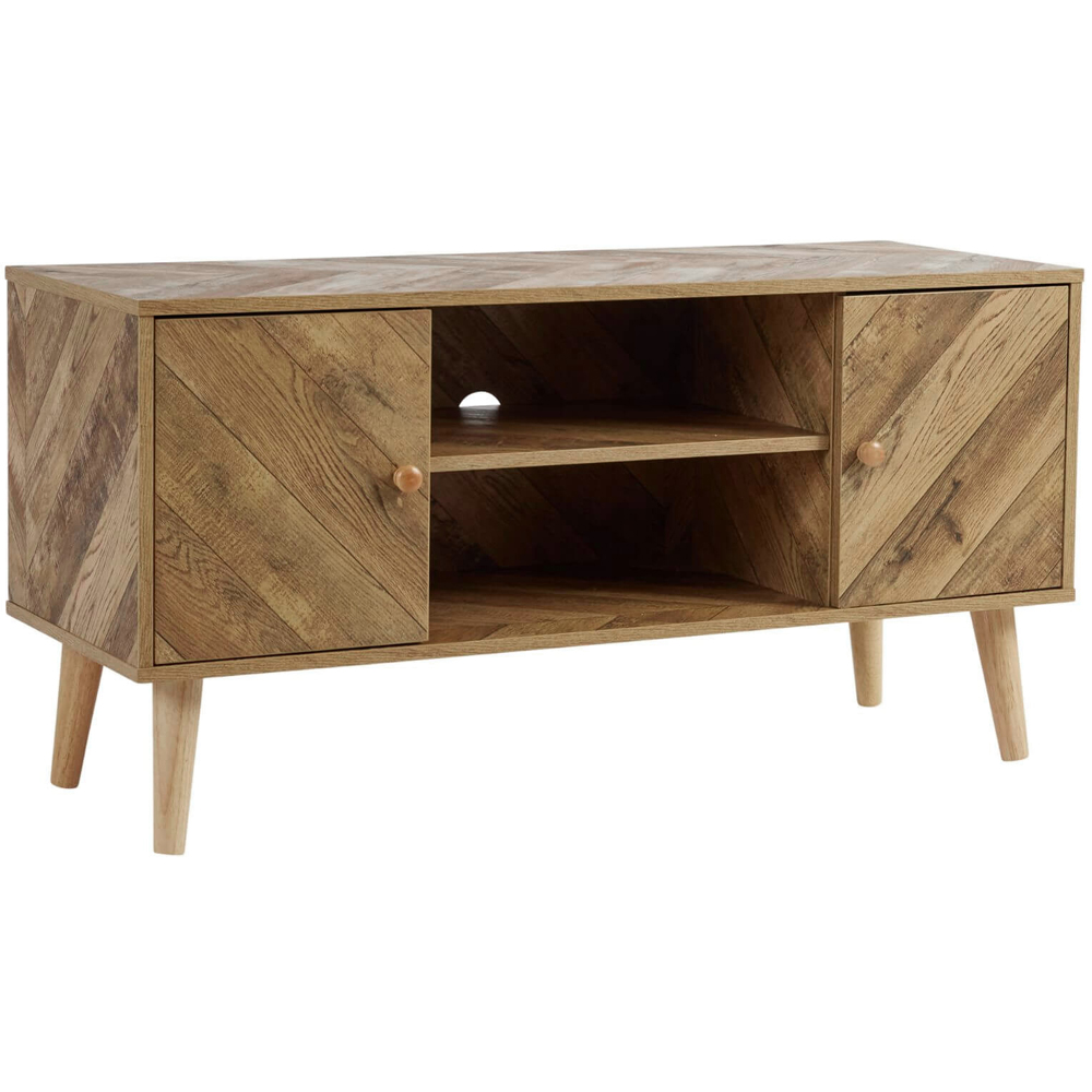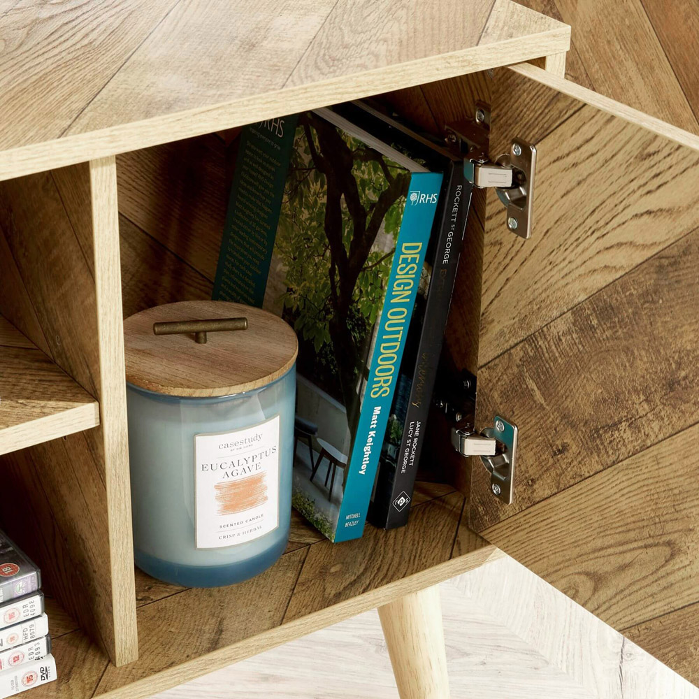 The Dallas 2-door TV unit is made from manufactured wood board with an embossed woodgrain effect foil. It features wooden turned handles and mid-century design tapered wooden legs that elevate the cabinet, making it easy to clean around. The doors have fully adjustable hinges, ideal if your floor is a little uneven. There is plenty of storage and an adjustable shelf to maximise the space on offer to suit your own needs.