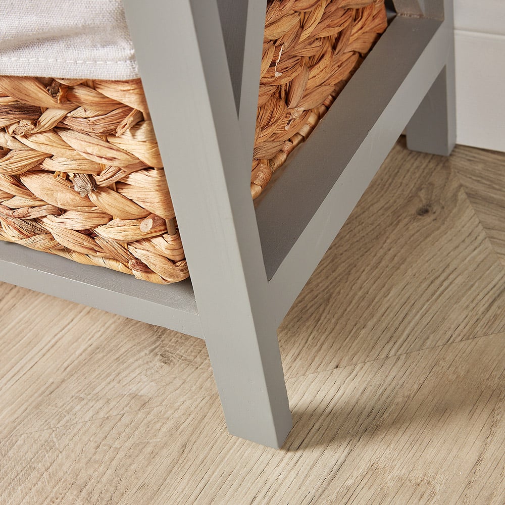 Bring a touch of coastal charm to your bedroom with the Home Source Dartmouth Single Drawer 2 Wicker Basket Grey Bedside Table in Grey. This piece effortlessly blends functionality with aesthetic appeal, featuring a sturdy wooden cabinet in a soothing grey tone, complemented by two robust, white fabric-lined wicker baskets. The flag-style cross-brace sides add a nautical flair, making it a perfect addition to any room looking for a hint of seaside inspiration. The smooth-running drawer, equipped with a metal finger cup handle, ensures easy access with minimal noise, making it ideal for storing a variety of items.