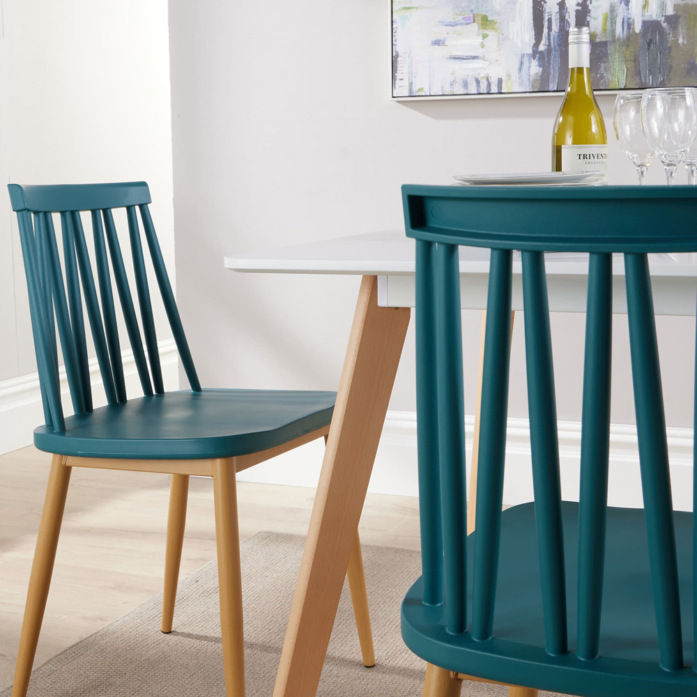 Elevate your dining experience with the Fleur Dining Table and 4 Teal Lucy Chairs, a contemporary set that combines style and functionality. The table, crafted from quality MDF and finished in a pristine white, features a clean design that complements any modern kitchen or dining area. Its wooden legs, angular and tapered, add a touch of elegance. The teal Lucy chairs, designed with a Scandi-inspired aesthetic, boast stylish tapered legs and a durable powder-coated metal base, ensuring both comfort and longevity. This set not only enhances the look of your space but also provides a perfect setting for family meals or entertaining guests.