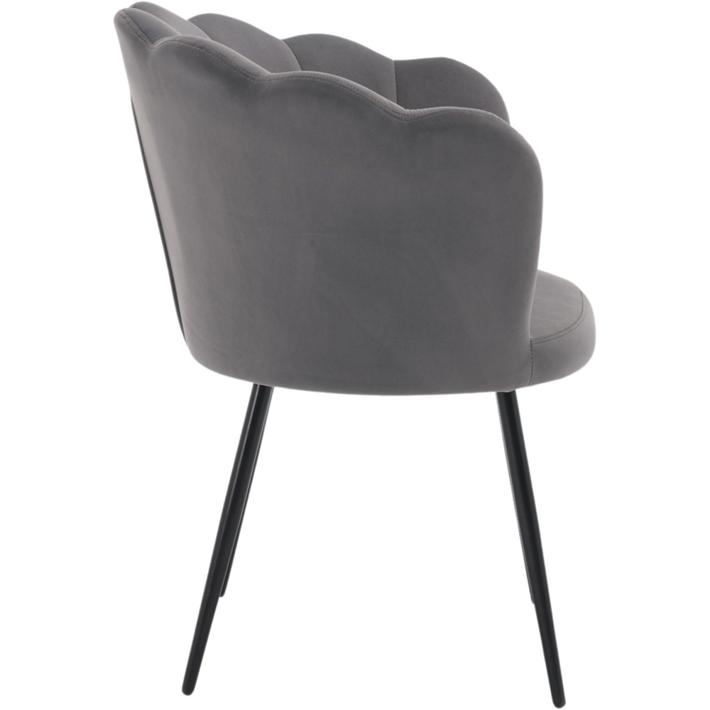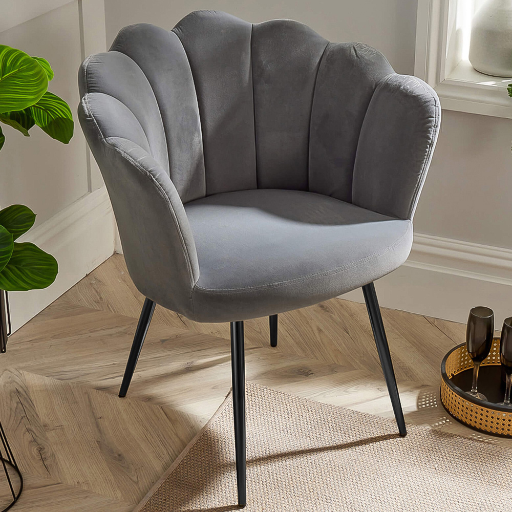 Create a chic focal point in your living space with the Home Source Grey Scallop Chair , featuring black metal legs that complement the trendy grey upholstery. This chair's compact design ensures it fits seamlessly into any room, be it your living room, bedroom, or dining area. The deep, soft seat cushion and padded pleated back offer a comfortable seating experience, while the elegant curve adds a touch of sophistication. Upholstered in plush velvet, this chair captures a modern vibe with its brushed stainless steel tapered legs, making it not only a comfortable choice but also a stylish one.