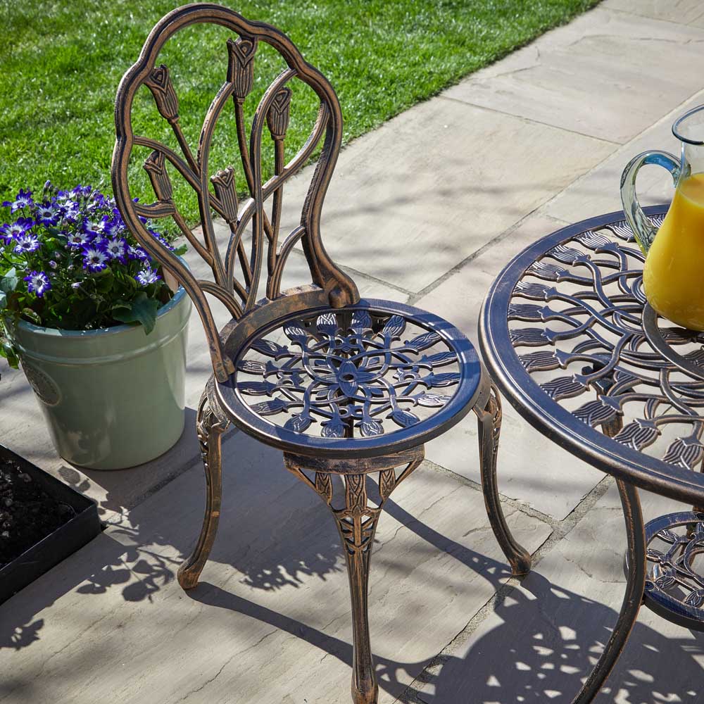 The Laurel bistro set is crafted using high-quality aluminium and has a floral design on the table and the chairs. It has a matching round table, both have a powder-coated finish for added protection against the elements. It’s the perfect compact garden set to have in your garden, patio or balcony. The table also features a parasol hole to keep you in the shade on those sunnier days. The table and chairs are flat-packed for easy home assembly.