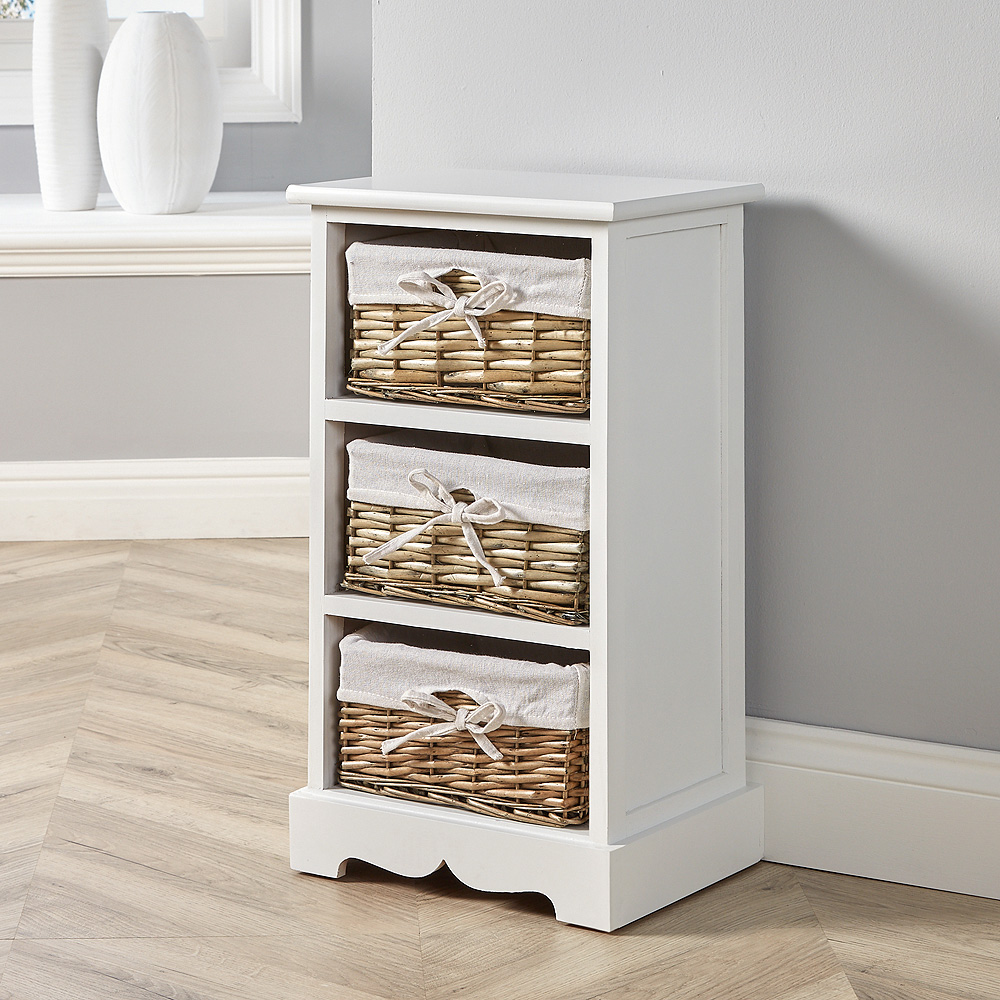Enhance your home storage with the Home Source Lichfield 3 Wicker Basket White Storage Unit, a beautifully crafted piece that combines functionality with aesthetic appeal. Featuring three natural half-willow weave baskets, each fully lined for protection and privacy, this unit is a versatile addition to any room. Whether it's organising shoes in the hallway or tidying away essentials in the lounge or bathroom, this white wicker basket storage unit is ready to use with no assembly required, and its charming scalloped base adds a touch of elegance to your decor.