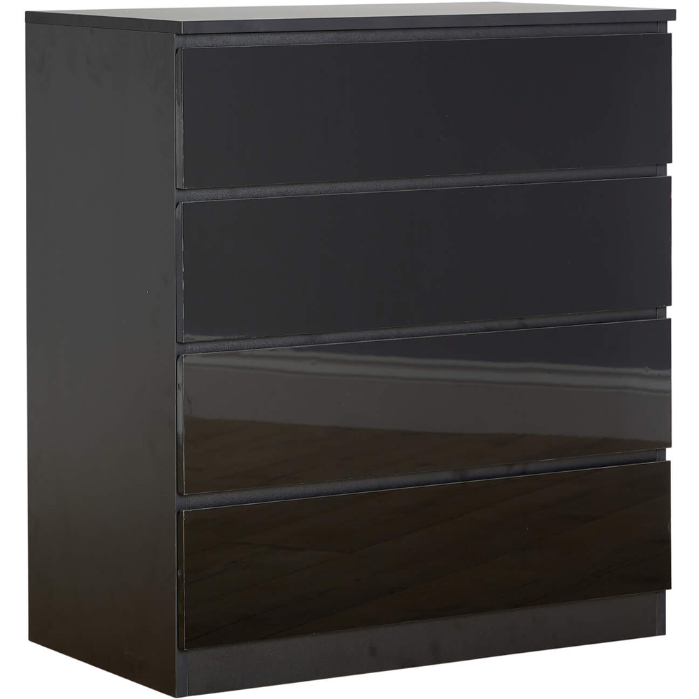 Enhance your bedroom's aesthetic with the Home Source Lugano Black 4 Drawer Chest of Drawers, featuring high gloss UV drawer fronts that radiate a contemporary charm. Crafted from a robust blend of MDF and particle board, this unit is not only stylish but also practical, offering spacious storage for clothing, accessories, and other essentials. The sleek design includes hidden handles and a compact footprint that fits seamlessly into any space. Arriving flat-packed, it's straightforward to assemble, ensuring you can enjoy this elegant addition to your home without any hassle.
