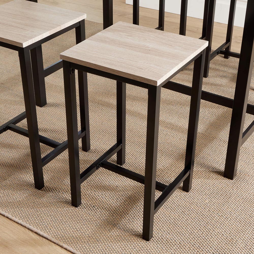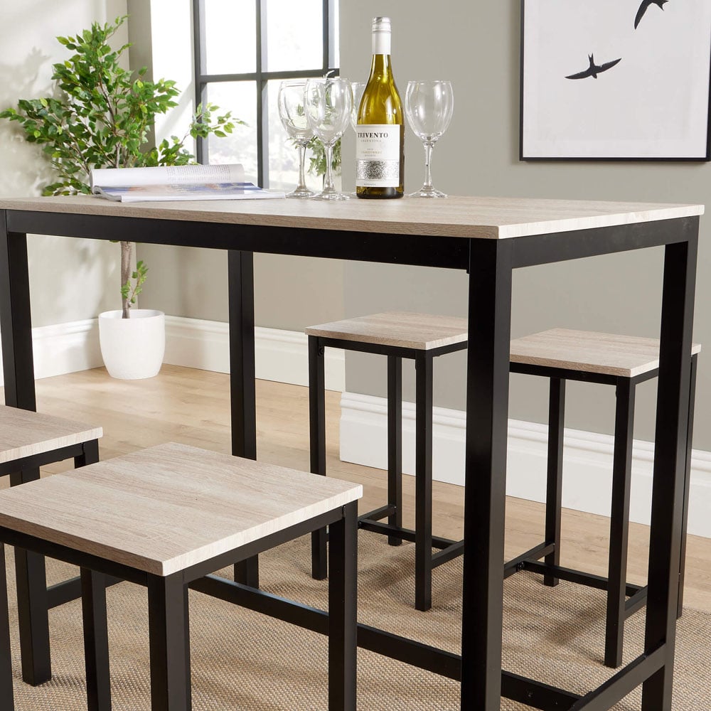 Transform your dining experience with this stylish and versatile 5-piece set. Featuring a robust steel frame and beautiful wood finish, this dining set includes one spacious table and four matching stools. Its compact design makes it perfect for small spaces while providing ample room for meals, work, and gatherings. The clean lines and modern industrial aesthetic blend seamlessly with any decor style, from contemporary to rustic. This compact dining set is finished with a light oak MDF top. Table Size = (W) 100cm (D) 60cm (H) 87cm Stool Size = (W) 32cm (D) 32cm (H) 57cm.