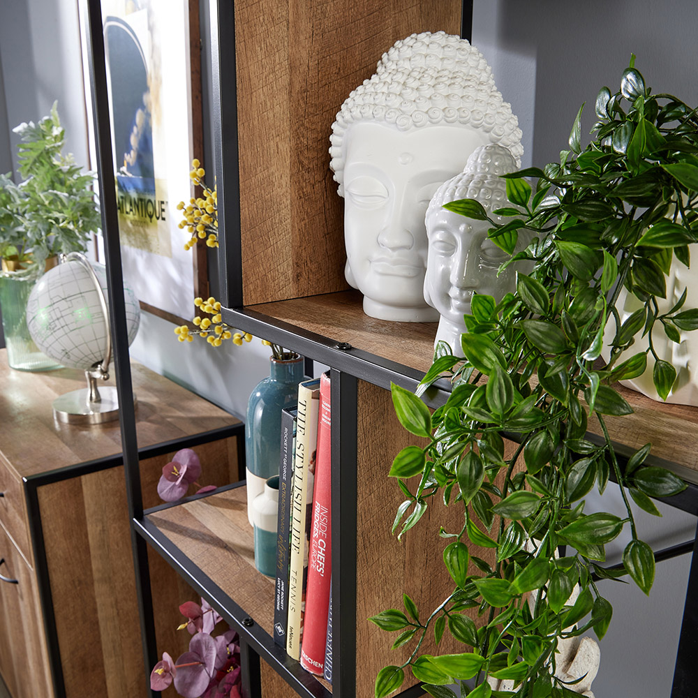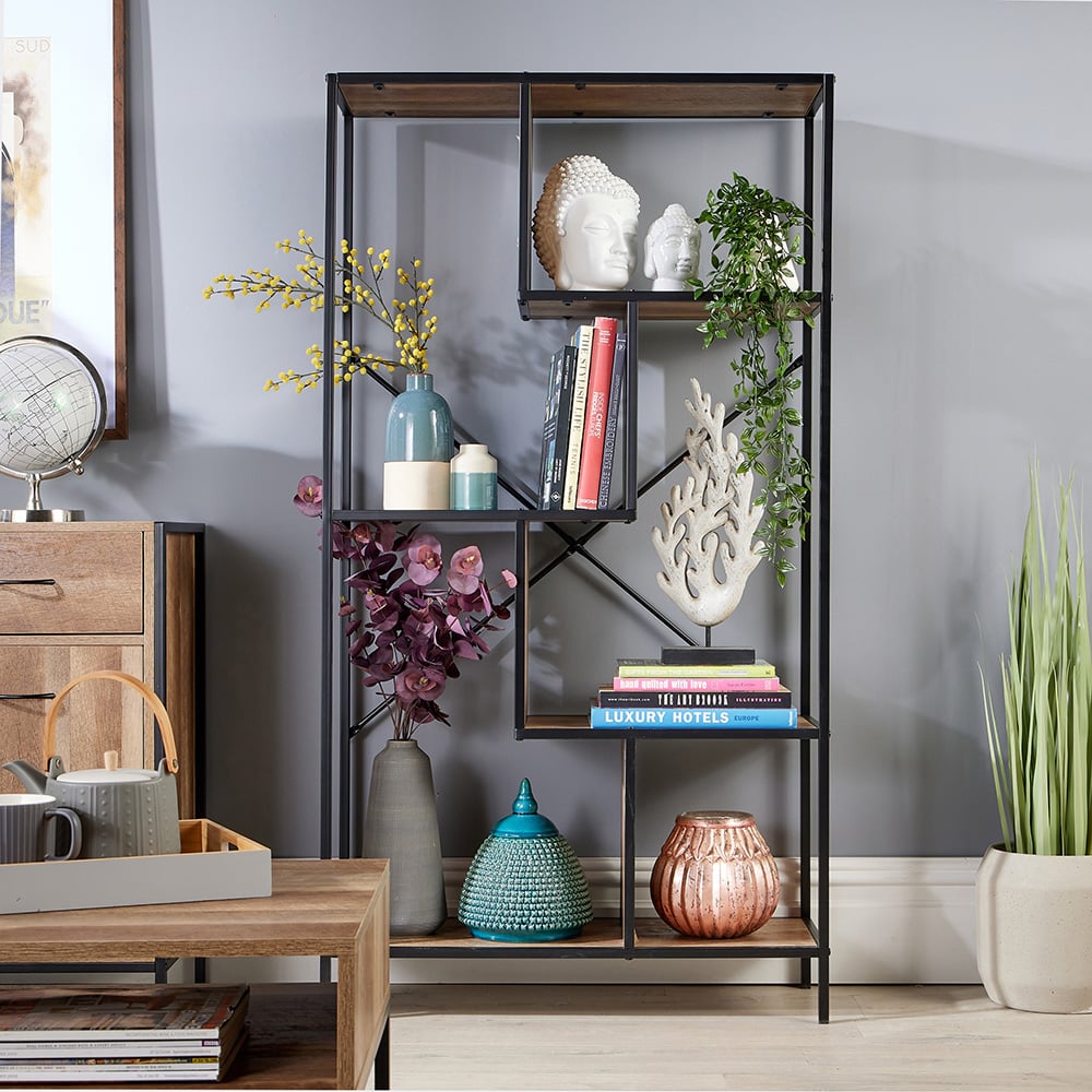 Bring industrial flair and functionality into your living space with the Oakmere Industrial Large Bookcase Shelving Storage Unit in sleek black. This eye-catching piece not only serves as a practical storage solution but also as a modern art installation with its abstract arrangement of variously sized shelves. The sturdy black metal frame complements the weathered oak finish of the shelves, creating a striking contrast that enhances any room. Whether for books, decor, or to simply make a statement, this shelving unit transforms your living area into a chic and organized space.