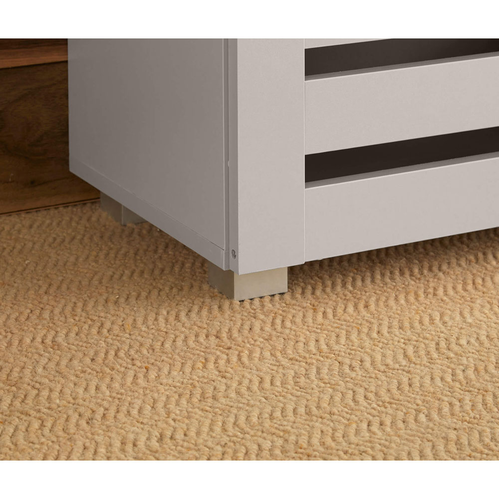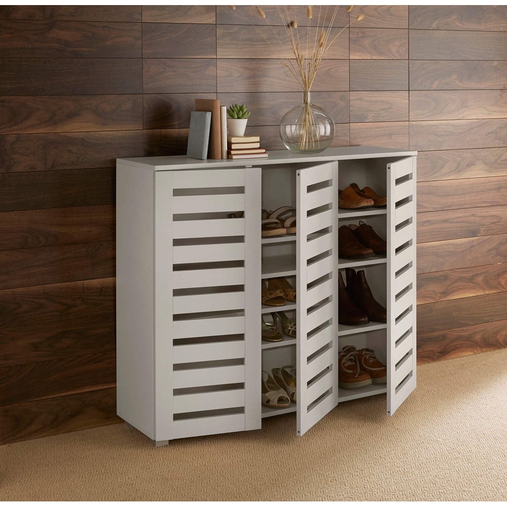 This three-door shoe cabinet is made in grey. It is the perfect storage facility for a household with lots of shoes that need putting out of sight, so you can enjoy a clutter-free area. Your footwear is easily accessed through the simple to-open cabinet doors. Minimalistic and sleek in design, this three-door shoe cabinet will match any decor without taking over the room and features slats on the outside. This is an elegant but modest addition to your home. Size = (W) 114cm (D) 33.6cm (H) 98.2cm.