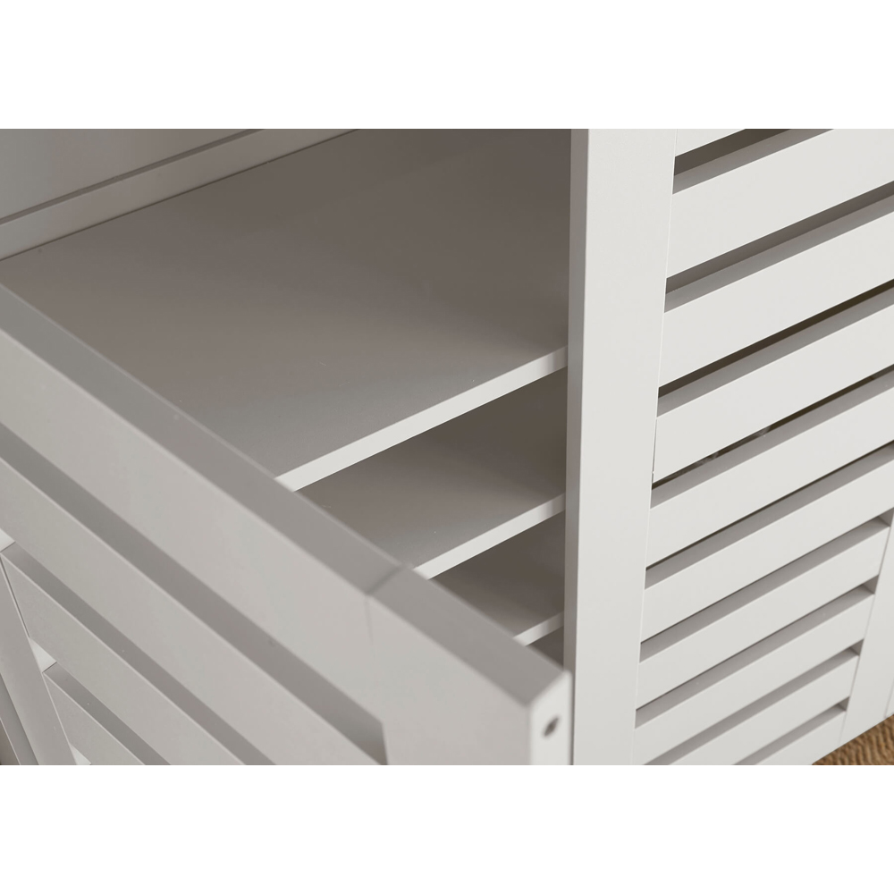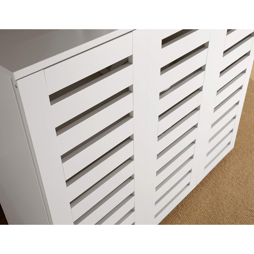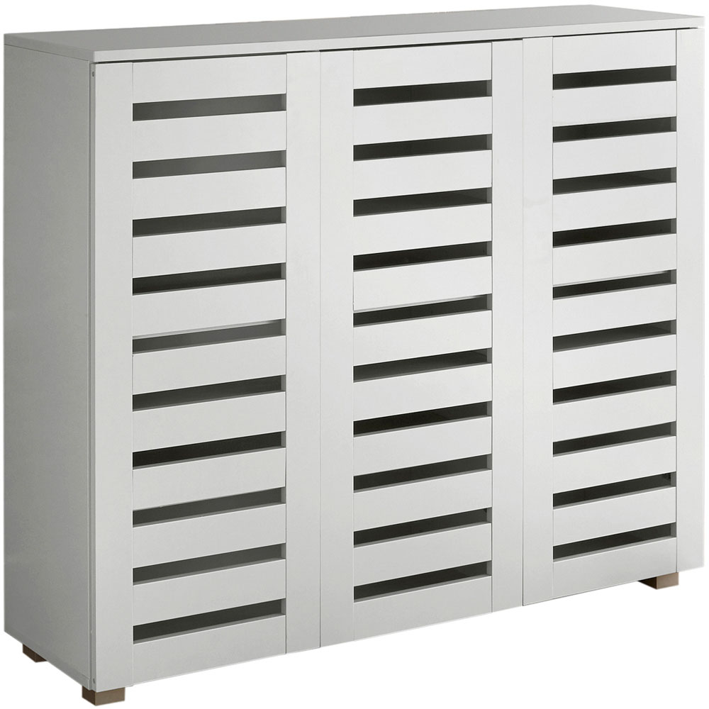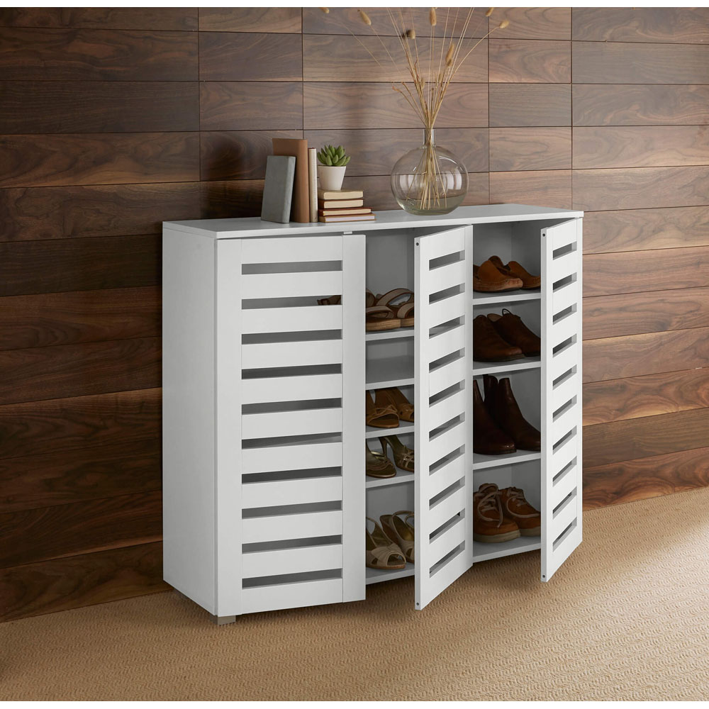 This three-door shoe cabinet is made in white. It is the perfect storage facility for a household with lots of shoes that need putting out of sight, so you can enjoy a clutter-free area. Your footwear is easily accessed through the simple to-open cabinet doors. Minimalistic and sleek in design, this three-door shoe cabinet will match any decor without taking over the room and features slats on the outside. This is an elegant but modest addition to your home. Size = (W) 114cm (D) 34cm (H) 98cm. Flat-packed for easy home assembly.