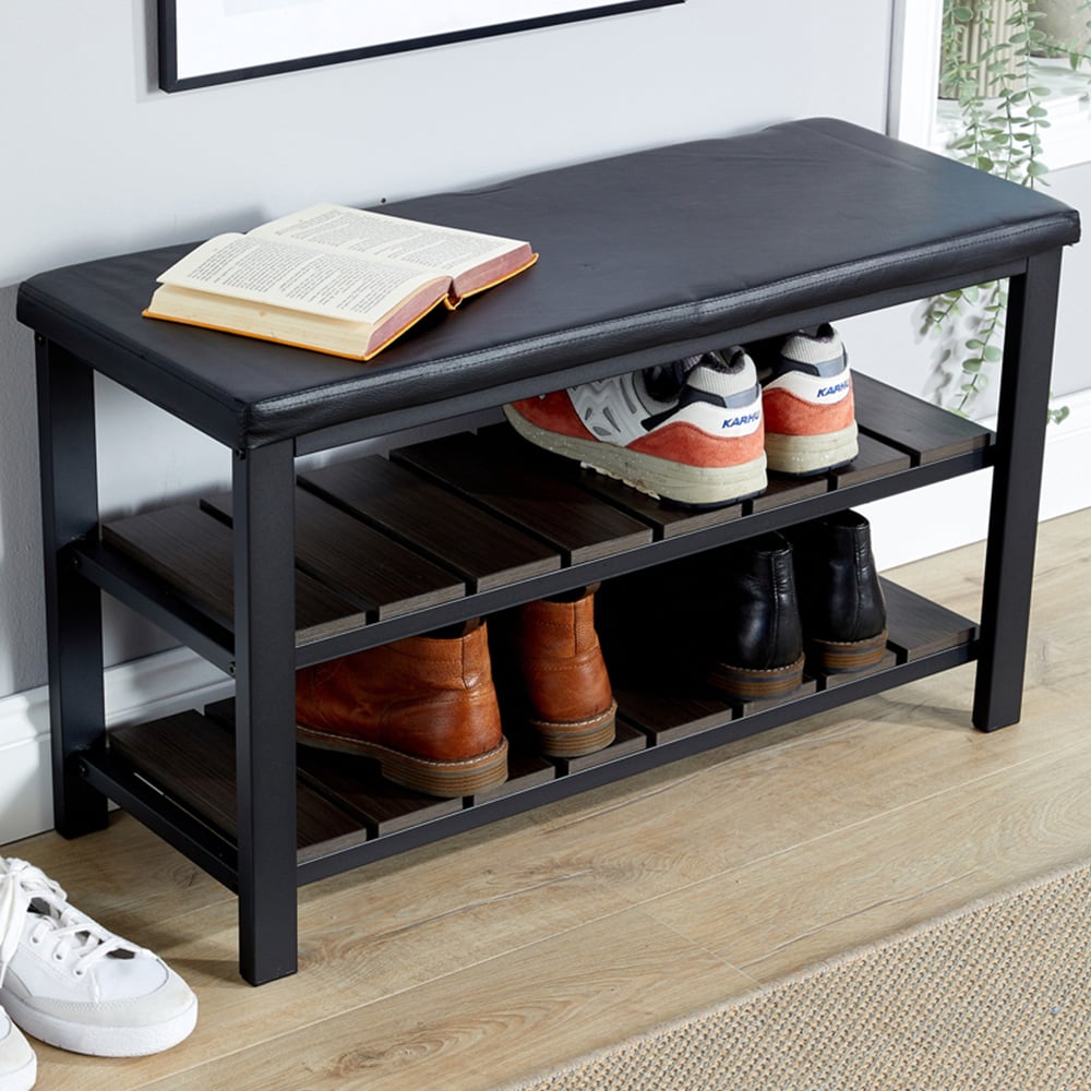 Home Source Spalding 2 Shelf Black PU Upholstered Metal Shoe Bench