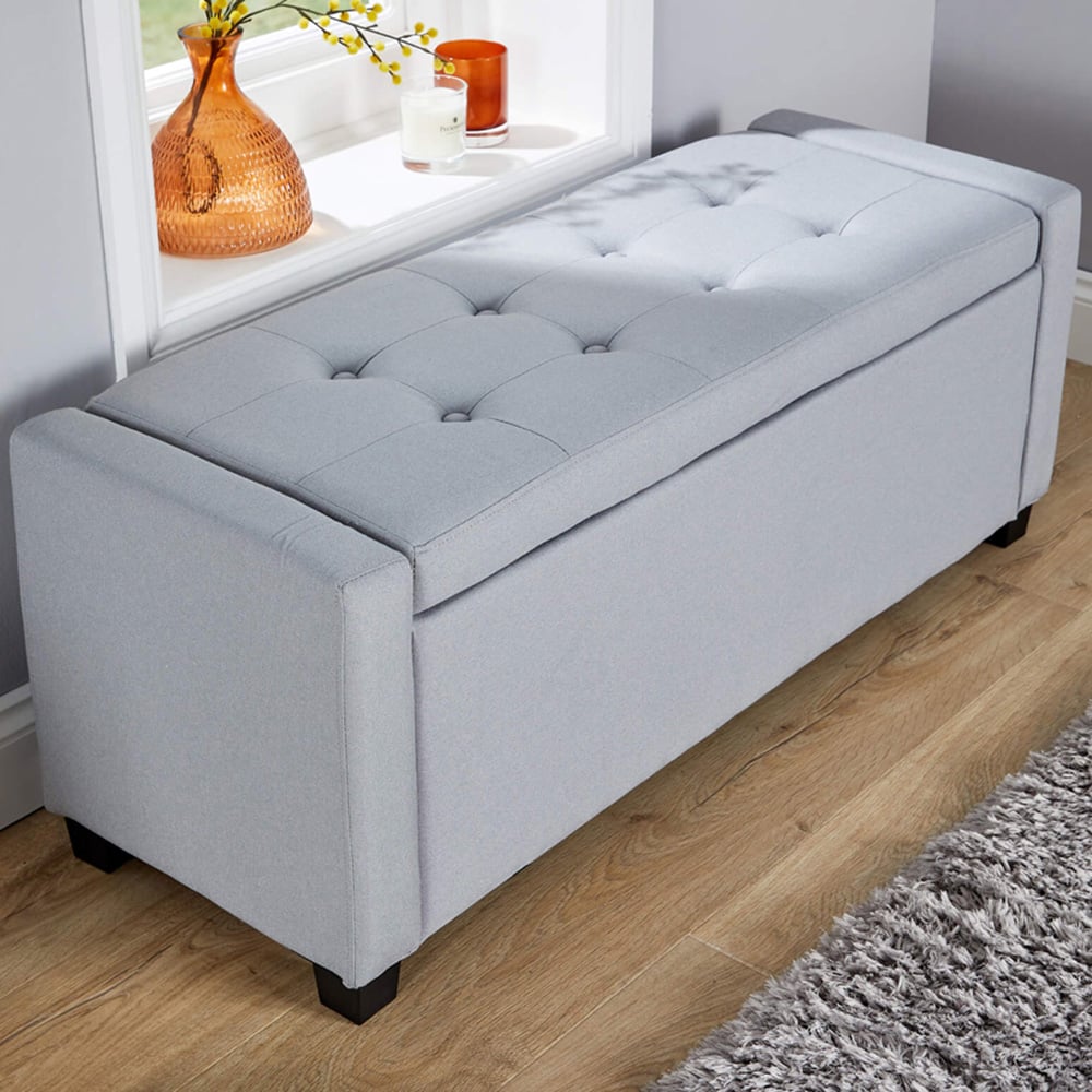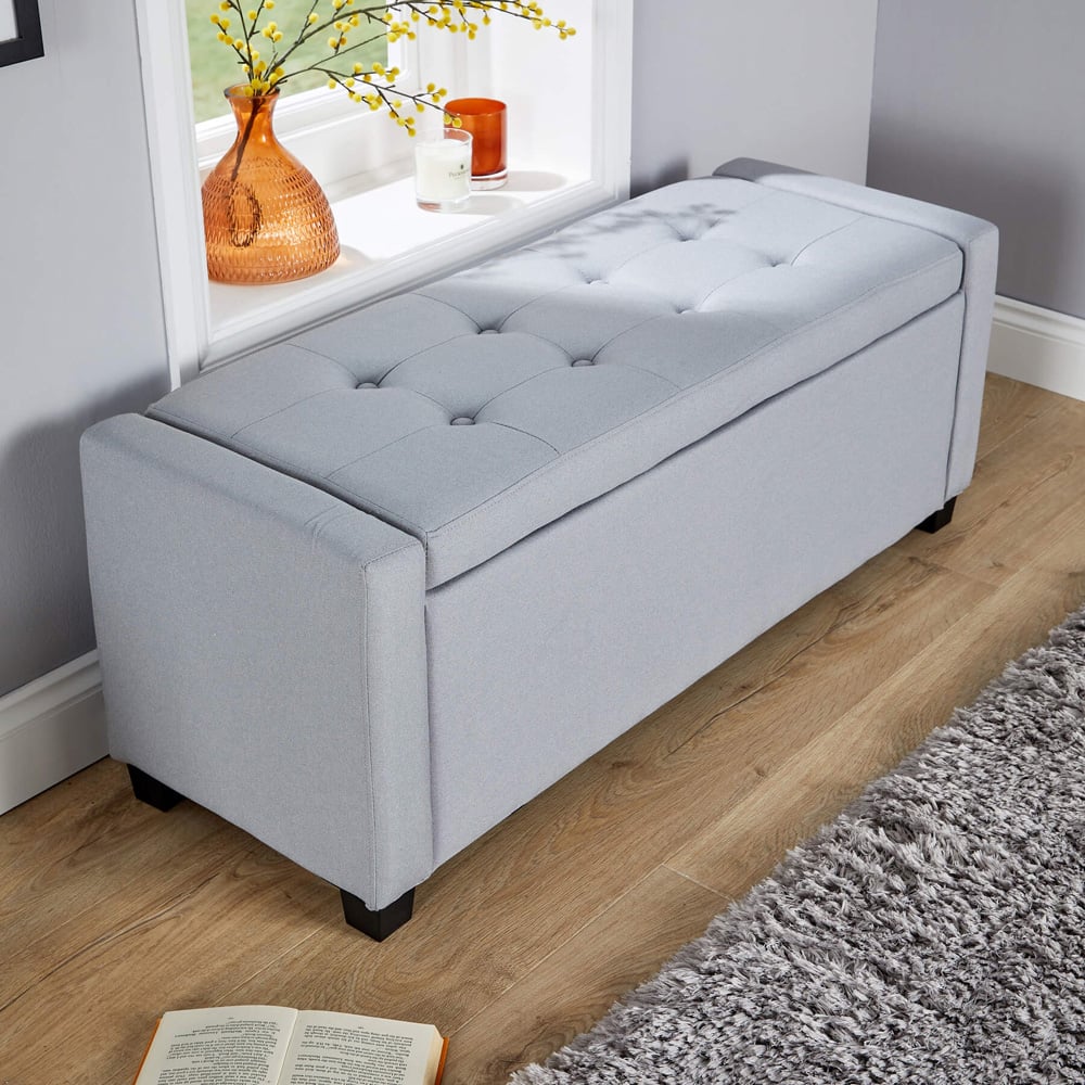 Part of our Ottoman Collection, this Verona Storage Ottoman is the quickest easiest way to tidy a room: just open the lid, pop things inside and that's it: your room is cleared from clutter which helps you relax and enjoy some proper me-time where you can unwind and out your feet up. Have this Storage Ottoman in it's traditional place at the end of a bed and stores bedding and blankets in guest rooms, toys and teddies, schoolwork and sports equipment in in children's rooms and for clothes and shoes, hats and fascinators in your bedroom. Lifting the lid is easy as it has a simple fabric tab. The lid stays put at the angle you open it as it has a gas strut. Similar to a gas lift on an office chair: this strut means that you don't have to hold it open with one hand: you have to roam inside. Size: W110cm x D40cm x H40cm.