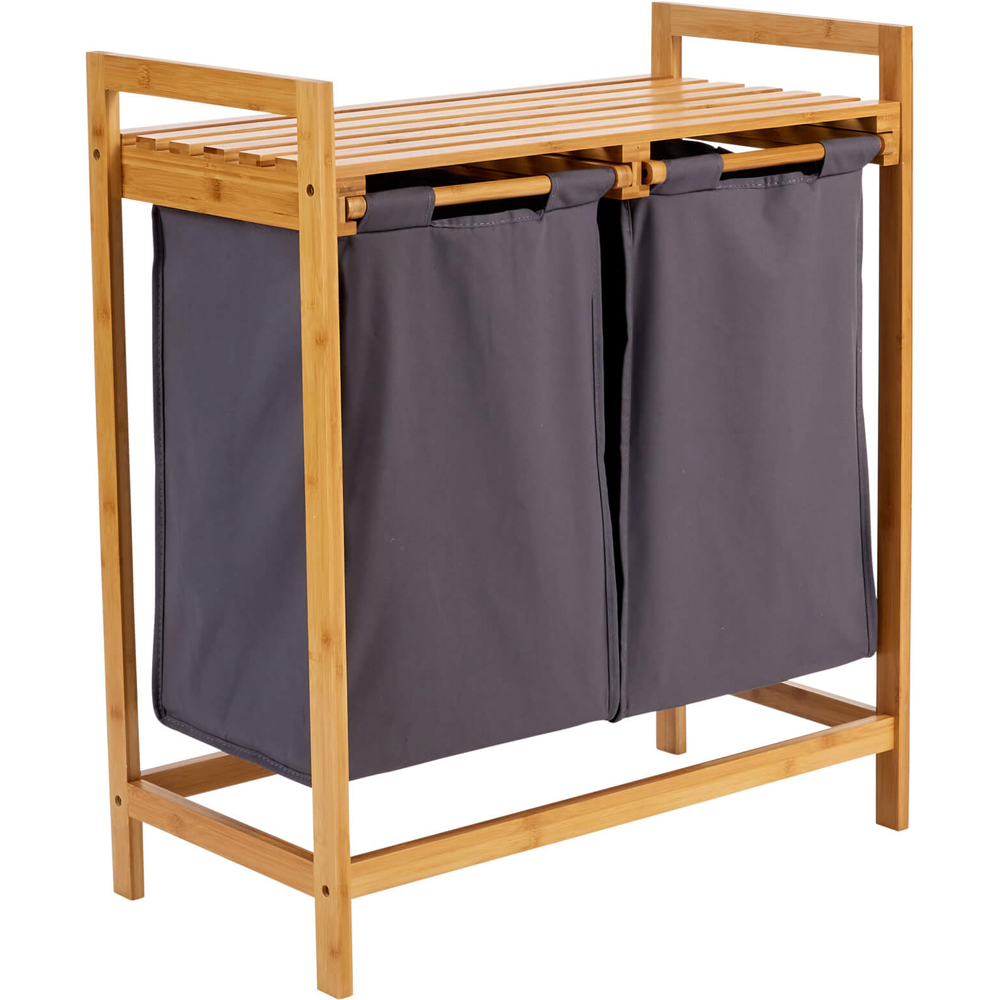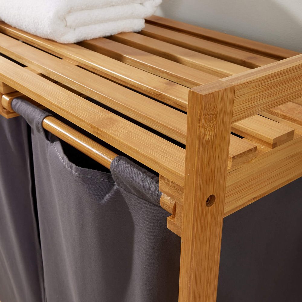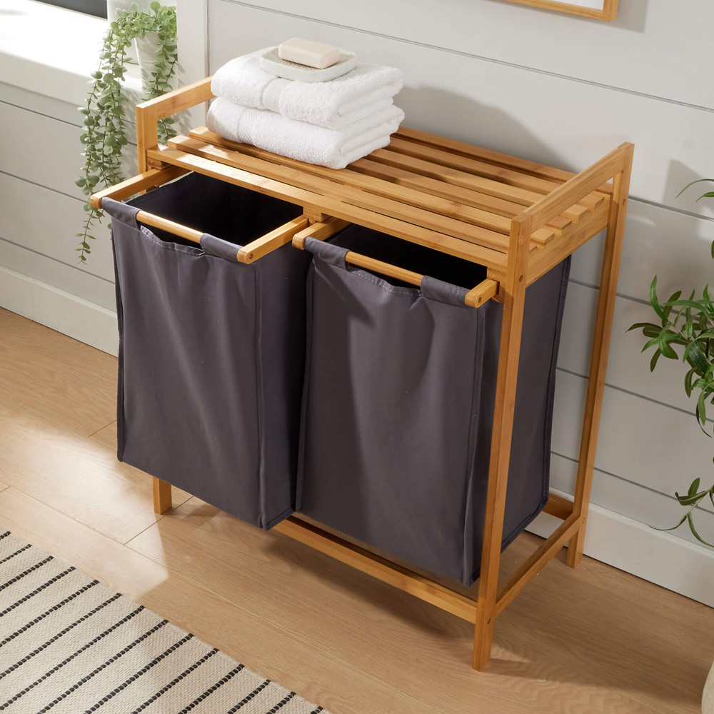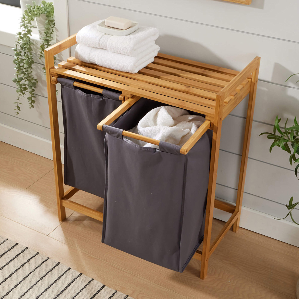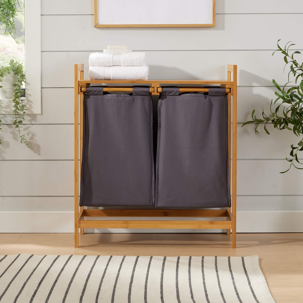 Experience the charm and practicality of the Walton Bamboo Laundry Basket, an essential addition to any home seeking organised bliss. Crafted from durable bamboo with a protective lacquer finish, this laundry basket features two removable grey fabric compartments, making sorting and accessing laundry effortless. Perfectly sized for kitchens, utility rooms, or bathrooms, it also boasts additional shelf storage on top for extra convenience.