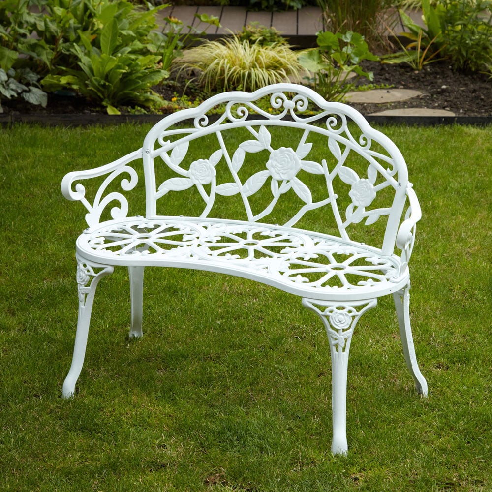 Enhance your outdoor space with the charm of the Home Source Rose Detail Outdoor Garden Bench in white, a delightful addition to any patio, balcony, or garden. Crafted from 100% cast aluminium, this bench combines durability with lightweight convenience, making it easy to move and position as desired. Its Victorian-style rambling rose design, complete with a gently curved back and scalloped silhouette, adds a touch of elegance and a nod to Queen Anne-style legs. The durable all-weather-resistant green paint finish ensures it stands up to the elements, allowing you to enjoy the beauty of your outdoor surroundings in comfort and style.