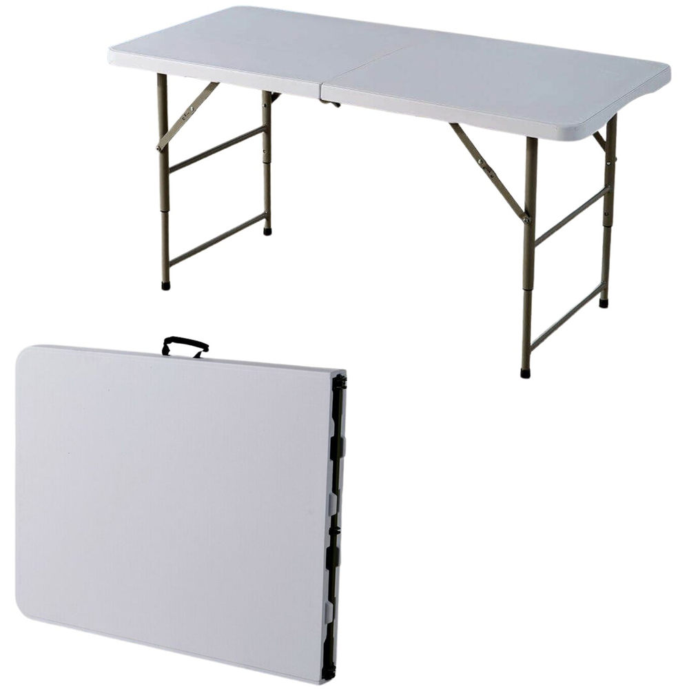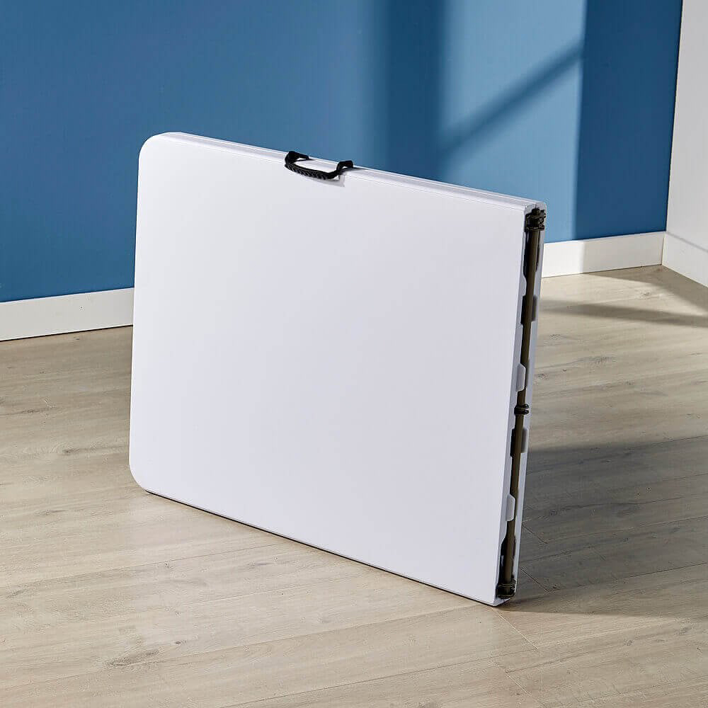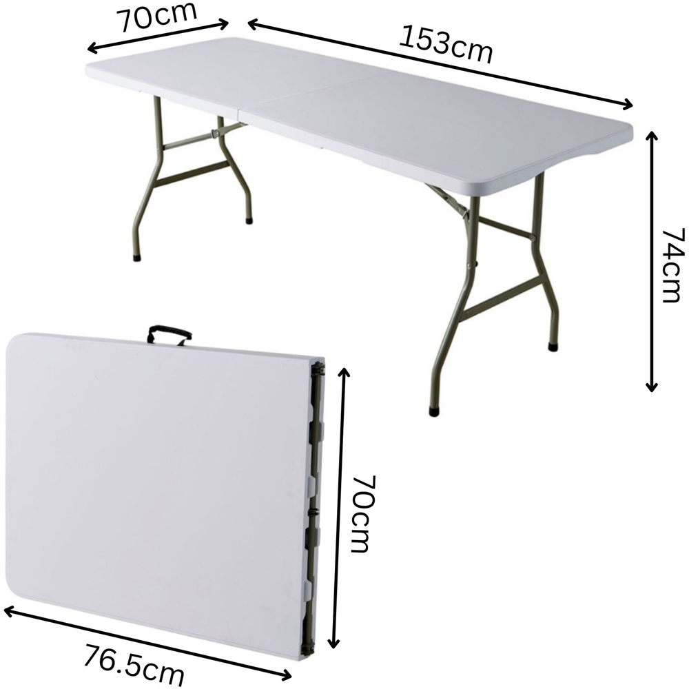 So versatile, our fold-out 5ft Trestle Table gives you so many options whether you use it inside or outdoors. It is ideal as a dining table extension when all the family come around, or for holding a large dinner party. Plus, it is perfect for holding buffet food, drinks and more for parties, buffets and barbecues. Of course, it is great for decorating too and unlike those cheap and nasty spindly hardboard decorating tables, it will not sag in the middle, whether it has wallpaper on it or wedding presents, cakes, or car boot selling stuff. Strong, robust and built to last. The High-Density Polyethylene (HDPE) white top is super strong and is supported by durable, stable black metal legs that have been powder-coated to give them long-lasting protection. It saves space, folding down to just 5.5cm deep, so it is easy enough to store out of the way in a utility room, shed, or garage, plus compact enough to pop into a car to take with you. Size = (W) 153cm (D) 70cm (H) 74cm