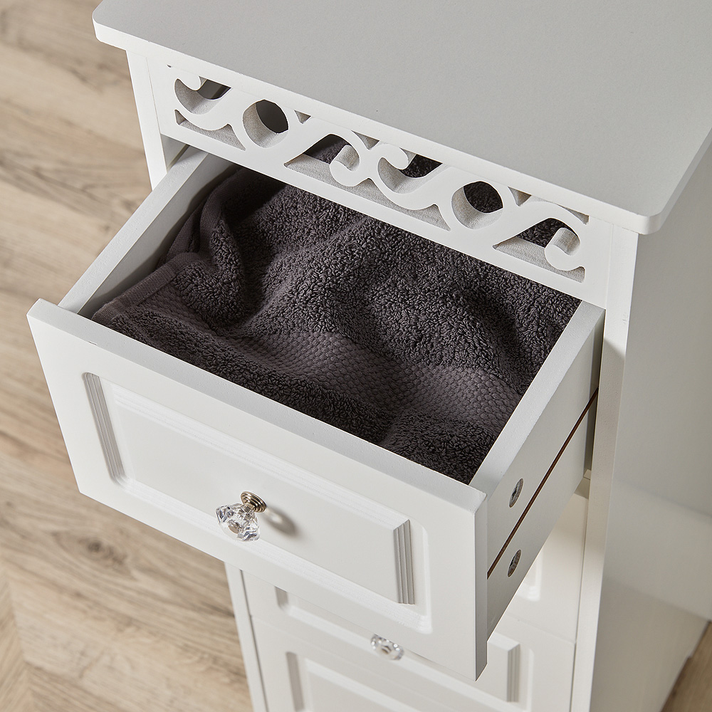 Elevate your bedroom's elegance with the Whitehaven 4 Drawer Chest Storage Unit, a pristine white freestanding piece that seamlessly blends functionality with a touch of sophistication. Crafted from high-quality MDF and featuring a solid wood frame, this chest boasts inset panel drawer fronts and crystal-style handles, all topped off with a beautifully sculptured scrolled top. Its compact design ensures it fits perfectly even in smaller spaces, while still offering ample storage across its four spacious drawers.
