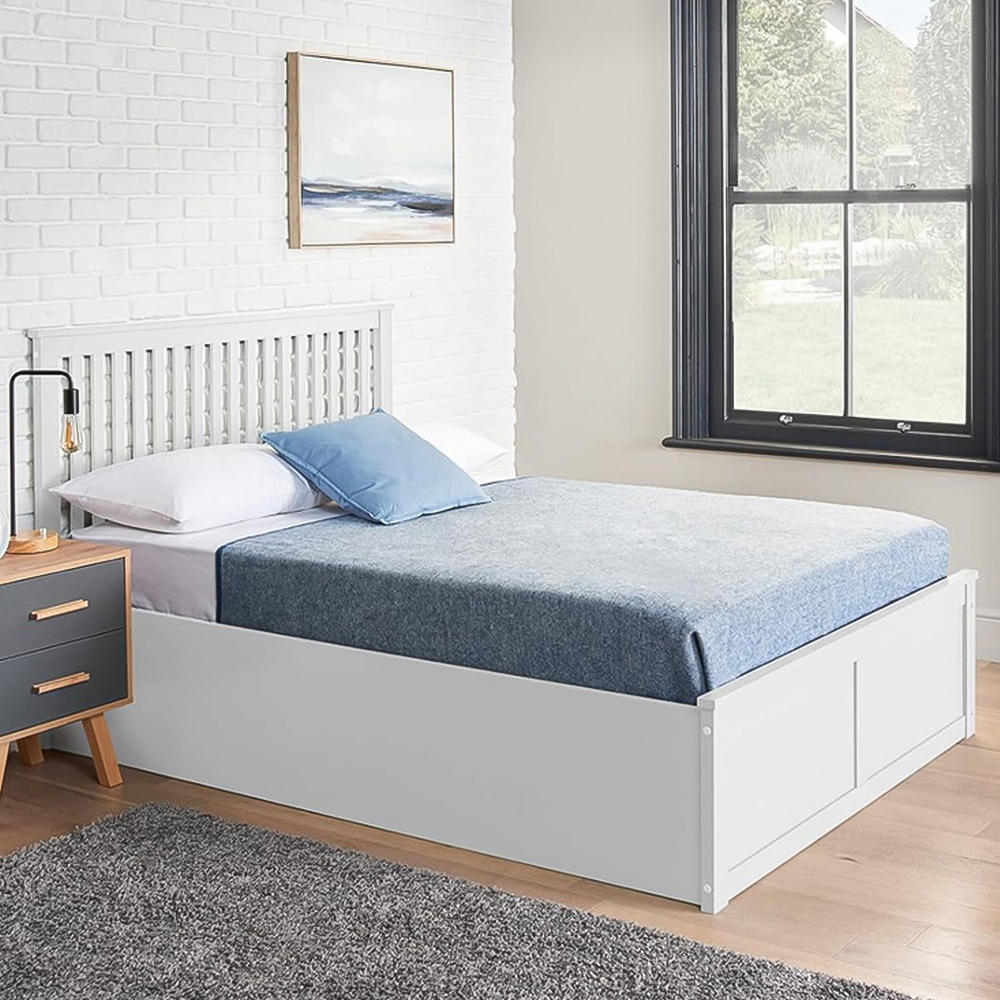 STYLISH - This solid wooden ottoman storage bed is perfect for creating extra space in your bedroom. With a huge under-bed storage compartment featuring easy dual gas lift access this bed makes a classic and practical addition to any bedroom. The contemporary design and neutral white colour are bang on trend and sure to effortlessly fit in with your bedroom interiors. DEEP STORAGE - Your bed has been specially designed to provide even more under-bed storage space. The bed base is 30cm deep which allows you to fit even more items under your bed. The under-bed storage compartment is perfect to fit duvets, clothes, pillows and any other items you need to store away. The bed comes with a fabric base which means your items will not directly touch the floor keeping them clean and safe. COMFORT - This ottoman storage bed frame features solid sprung wooden slats providing added support and extra comfort to help you get the best night's sleep possible. The perfect base for your mattress to help you drift off to sleep that much faster. DURABLE - This ottoman bed set is finished in hardwearing, high-quality hardwood. It has a strong steel internal frame and centre support legs. The quality construction of this bed results in a sturdy, durable frame making sure you have a comfortable place to sleep for years to come.