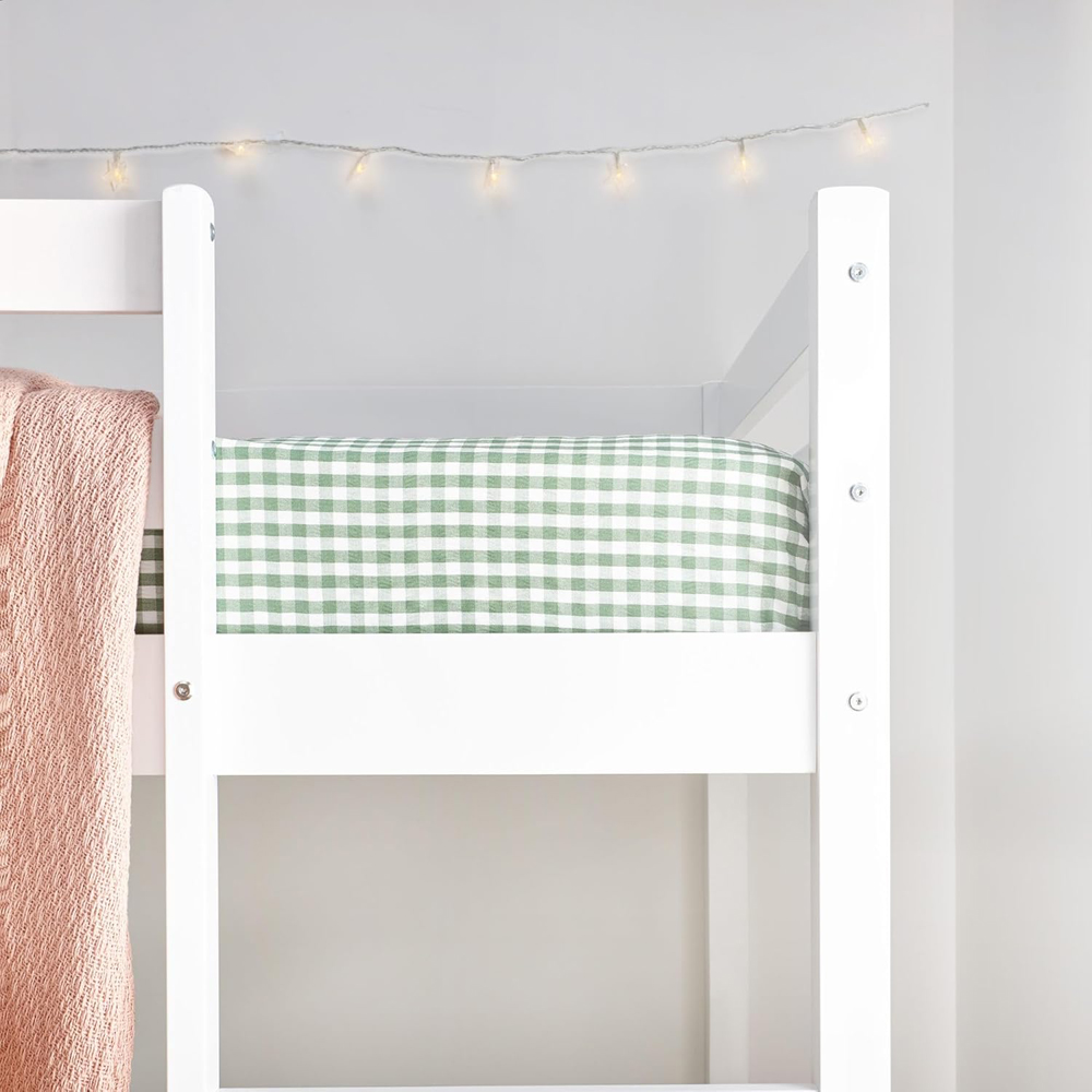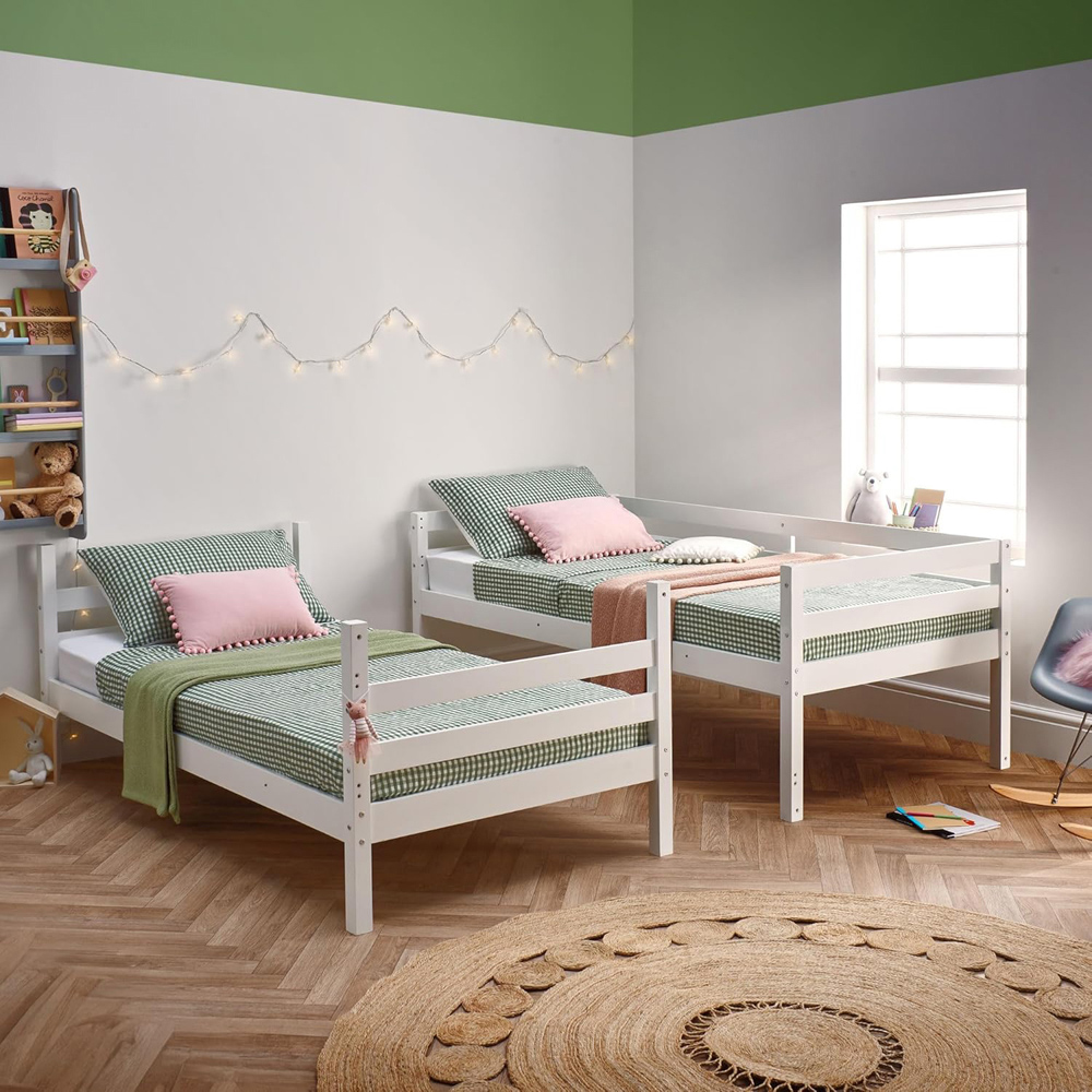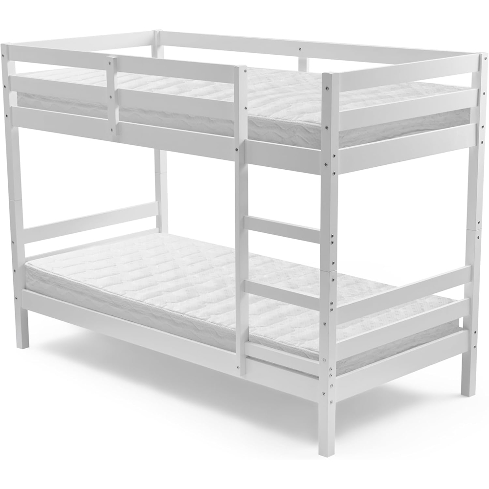Elegant- Bunk bed for kids finished in a smooth crisp white wood, a stylish addition that will blend into any bedroom décor. Thick base slats hold mattress and allow air to circulate. Splitable Bunk Bed – Twin sleeper with 2 levels and access ladder, sleep 2 children above each other in single bunk beds. Alternatively easily split into 2 single beds , 1 bed & 1 daybed with backrest, a versatile solution that adapts to growing families and guest rooms. Safe & Durable – Made from chunky solid pine wood the bunk bed frame has been designed to be stable & secure. Full length top guard rails keep sleeper in position with a wooden access ladder. Bunk bed safety tested & certified to EN747-1 & 2: 2012 + A1:2015. Space saving – Bunkbeds are idea for smaller rooms or for extra floor space for the bedroom. Create extra room in the bedroom by having in bunk bed setup. 20cm under bed & bunk bed floor clearance to store boxes toys clothes drawers underneath. 1 x Deluxe comfort pocket sprung mattress- Thick 16cm with up to 660 independent springs mould to the body. Padded quilted high density 400gsm foam top layer. Breathable hypoallergenic polyester cover. Medium Firm rating for all sleeping positions. Product Size- Single Bunk Bed 3ft fits single mattress 190 x 90cm . Product Size: L: 98cm x W:19.