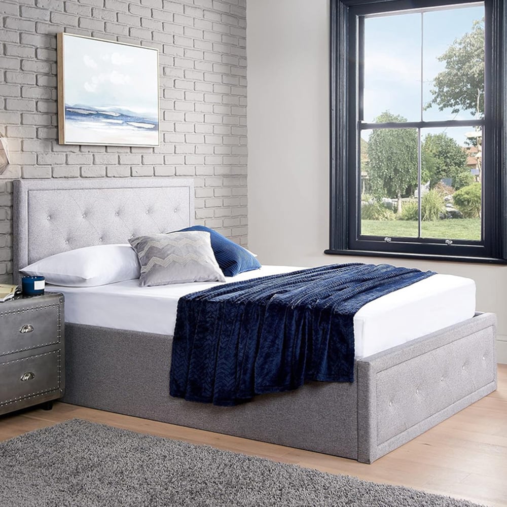 Make a cosy and elegant addition to your bedroom decor with the Home Treats Single Crystal Grey Ottoman Bed with Mattress. This bed provides both class and practicality with plenty of storage space. This bed is crafted using a high-quality steel frame for durability and longevity. It is upholstered with a durable and water-resistant grey linen finish. It features a luxurious bed frame with an embossed diamante finish and high-shine jewels on the padded headboard and footboard. This bed features a sprung slatted base with strong centre support beams to give natural bounce and provide greater comfort. It also features an easy lift gas mechanism for instant access to the 30cm deep concealed storage space. It includes a 20cm thick pocket sprung mattress with up to 660 independent pocket springs and a 2.5cm quilted foam top layer for added comfort. This Ottoman bed provides ultimate comfort with a sturdy base for stability and support.