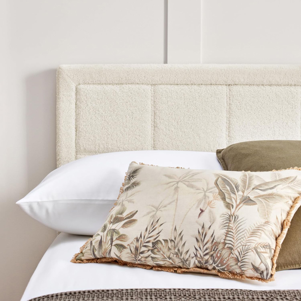 Add a touch of elegance to your bedroom with a bouclé storage bed frame. Plush thick ‘looped’ & ‘curled’ natural white fabric creates a sophisticated look. It features a padded headboard with form and function in mind. Create extra space in your bedroom with a large under-bed storage capacity to store all your belongings. This easy-access front-open gas lift-up bed frame comes with up to 900L of space with a fabric base sheet to keep items dust-free. The upholstered padded bed frame from a sound night’s sleep with sprung slats to absorb and support the weight. It comes fully upholstered in bouclé fabric on all sides for a luxurious, plush soft touch finish. It is made from the highest quality materials including a robust steel internal frame, strong centre support beams, slats and extra middle support legs.