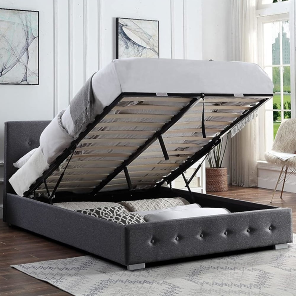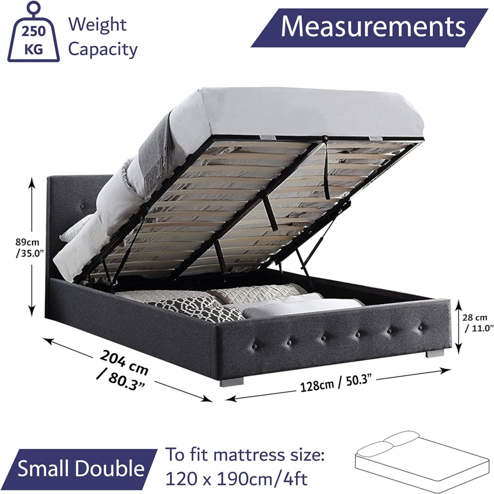 Make a delightful addition to your bedroom decor with the Home Treats Small Double Dark Grey Ottoman Bed. This bed provides both class and practicality with plenty of storage space. This bed is crafted using a high-quality steel frame for durability and longevity. It is upholstered with a durable and water-resistant grey linen fabric. It features a luxurious bed frame with a buttoned design on the padded headboard and footboard. This bed features a wooden sprung slatted base with strong centre support legs for natural bounce and greater comfort. It also features an easy gas lift mechanism with instant access to the concealed storage space. This Ottoman bed provides ultimate comfort with a sturdy base for stability and support.