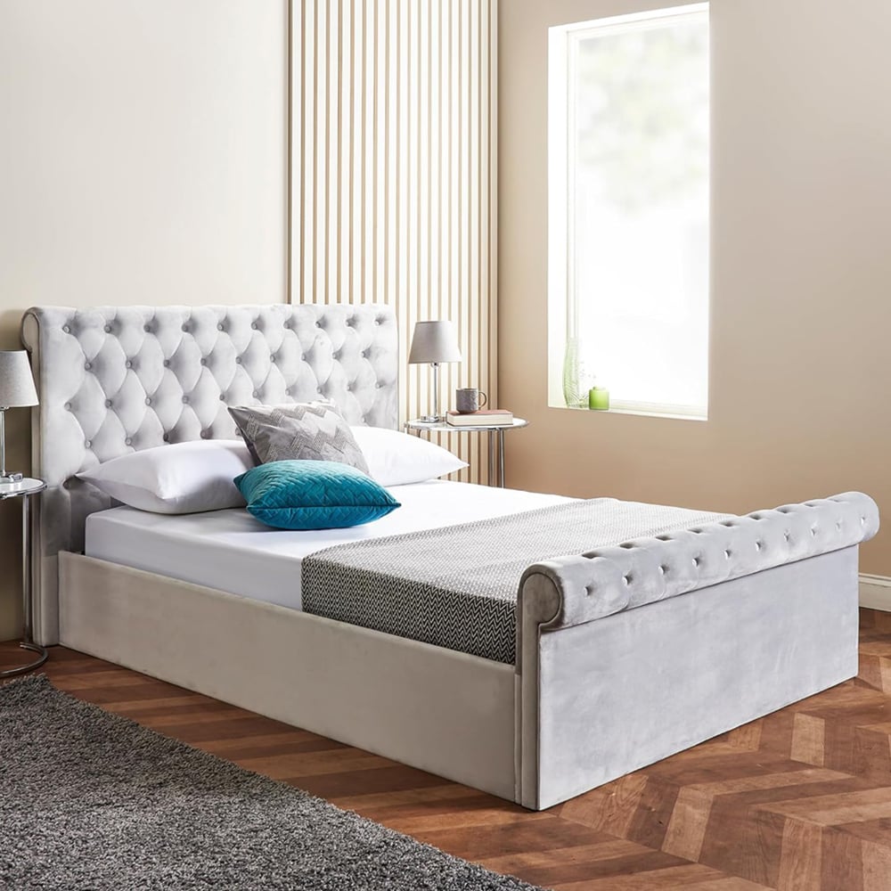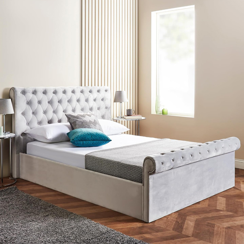 Elevate your room with the Home Treats Small Double Grey Brushed Velvet Ottoman Bed. It features grey two-tone brushed velvet with a sleigh design and buttons, this stylish ottoman storage bed frame will make a statement in any bedroom interior. You can create extra space in your bedroom with a huge capacity under-bed storage compartment. It can be installed with a left or right facing side lift and includes a fabric base. Enjoy the comfort of an extra padded premium finish headboard, footboard, base, and sides, along with sprung wooden slats that absorb body and mattress weight. Made from the highest quality materials, this bed features a steel inner frame, strong centre support beams, slats, and extra middle support legs for enhanced durability.
