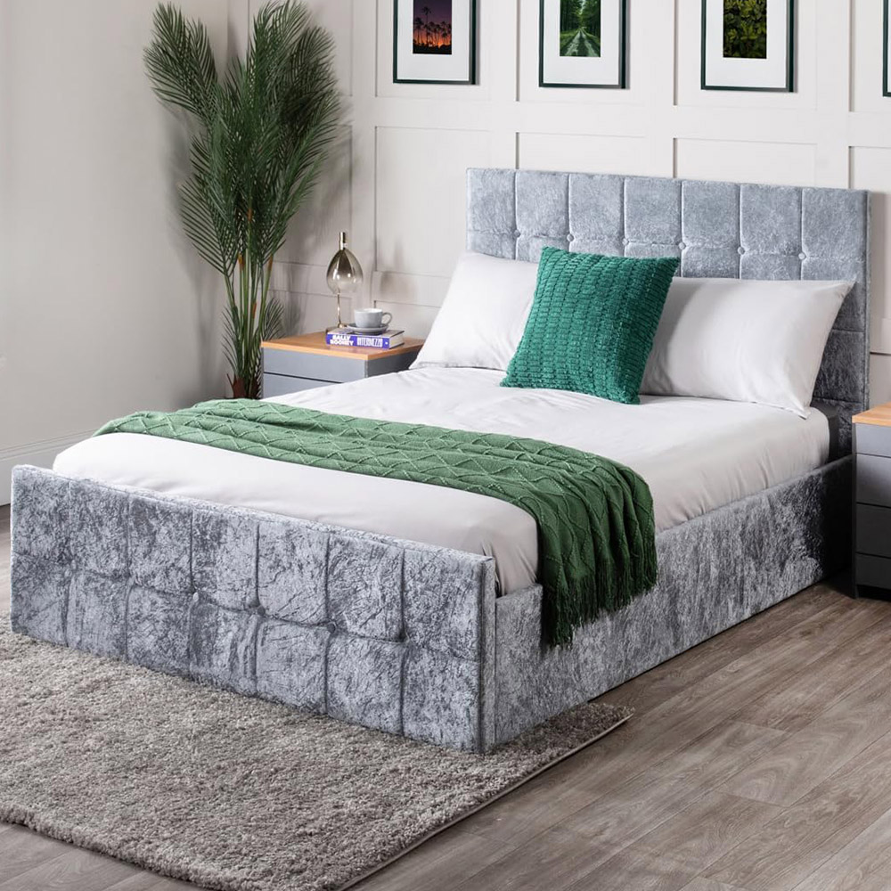 This bed is upholstered in a deluxe soft touch two-tone crushed velvet fabric. This ottoman storage bed frame will be a standout piece in your bedroom. Create extra space in your bedroom with a huge 900L capacity under-bed storage compartment. Fabric base included to keep your items dust-free. Padded headboard, base and sides with strong sprung wooden slats for support and strength. Extra plush headboard and footboard square design. Featuring an easy-access hydraulic dual lifting mechanism, this storage bed is made from the highest quality materials including the strong centre support beams and upholstered frame. The thick 16cm luxury pocket sprung mattress with independent pocket springs adapts to weight. With a breathable cool touch hypoallergenic cover, it is also anti-dust and anti-mite. The high-density foam top sleeping layer has a medium firm rating.