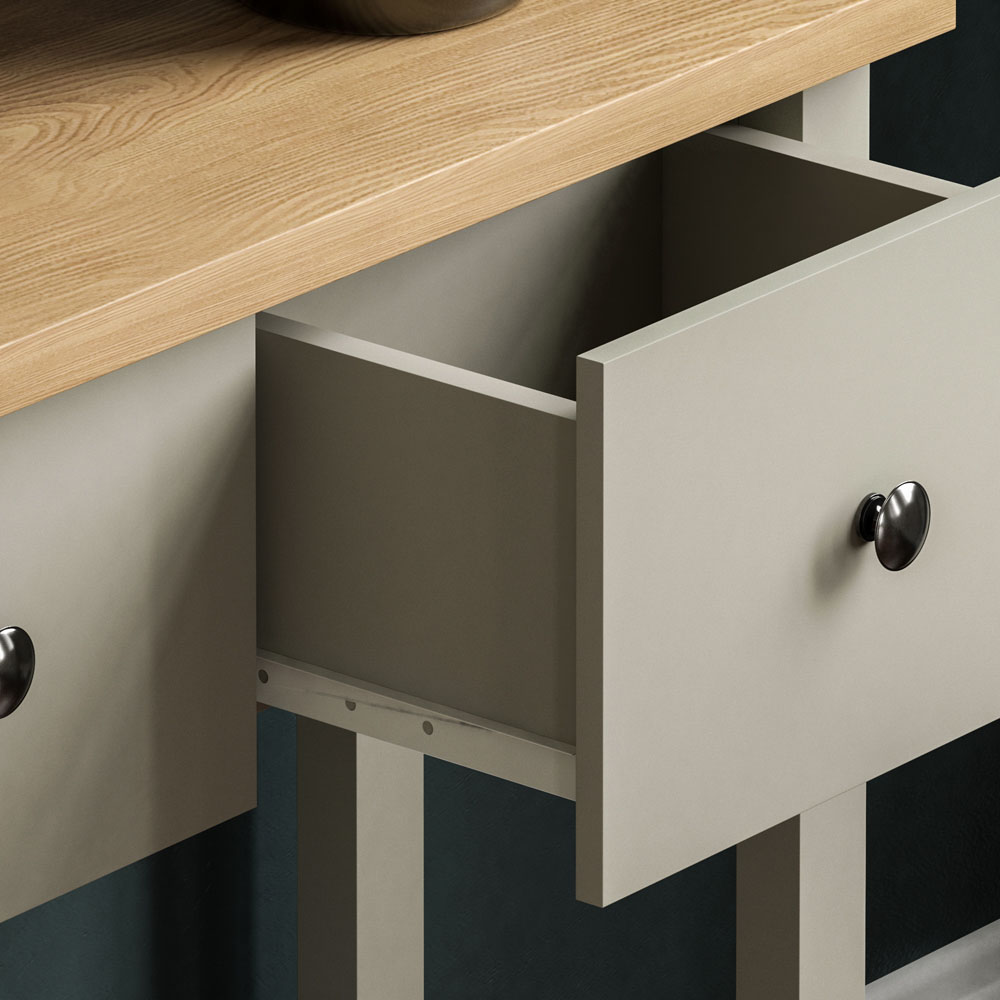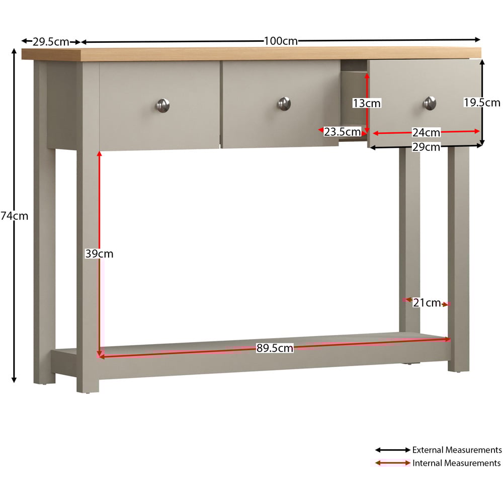 Introducing Home Vida Arlington 3-drawer console table with an underneath shelf, featuring a beautiful tabletop in a cHome Vida shaker style. This meticulously crafted piece combines functionality with timeless design. The spacious drawers provide convenient storage, while the underneath shelf offers additional space for display or organization. With its grey finish and oak table top, it adds a touch of sophistication to any room. Elevate your home decor with this stylish and versatile console table, a perfect blend of practicality and charm. Dimensions: H74 x W100 x D30cm.